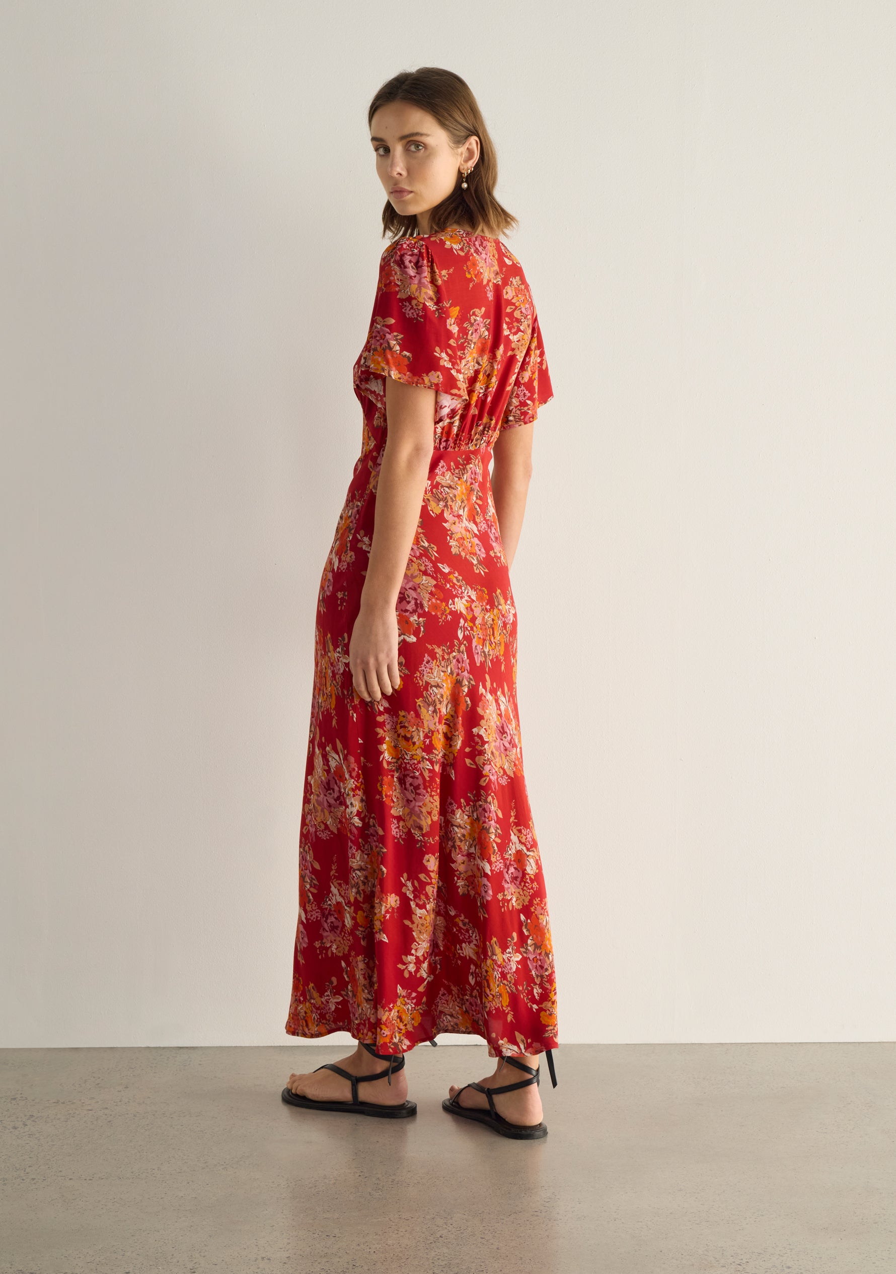 The Calais Midi Dress in our festive red Iris print is designed to turn heads. Featuring a refined V neckline framed with delicate lace trim, it skims the body with a flattering bias-cut silhouette—effortlessly contouring your shape and inviting endless compliments.