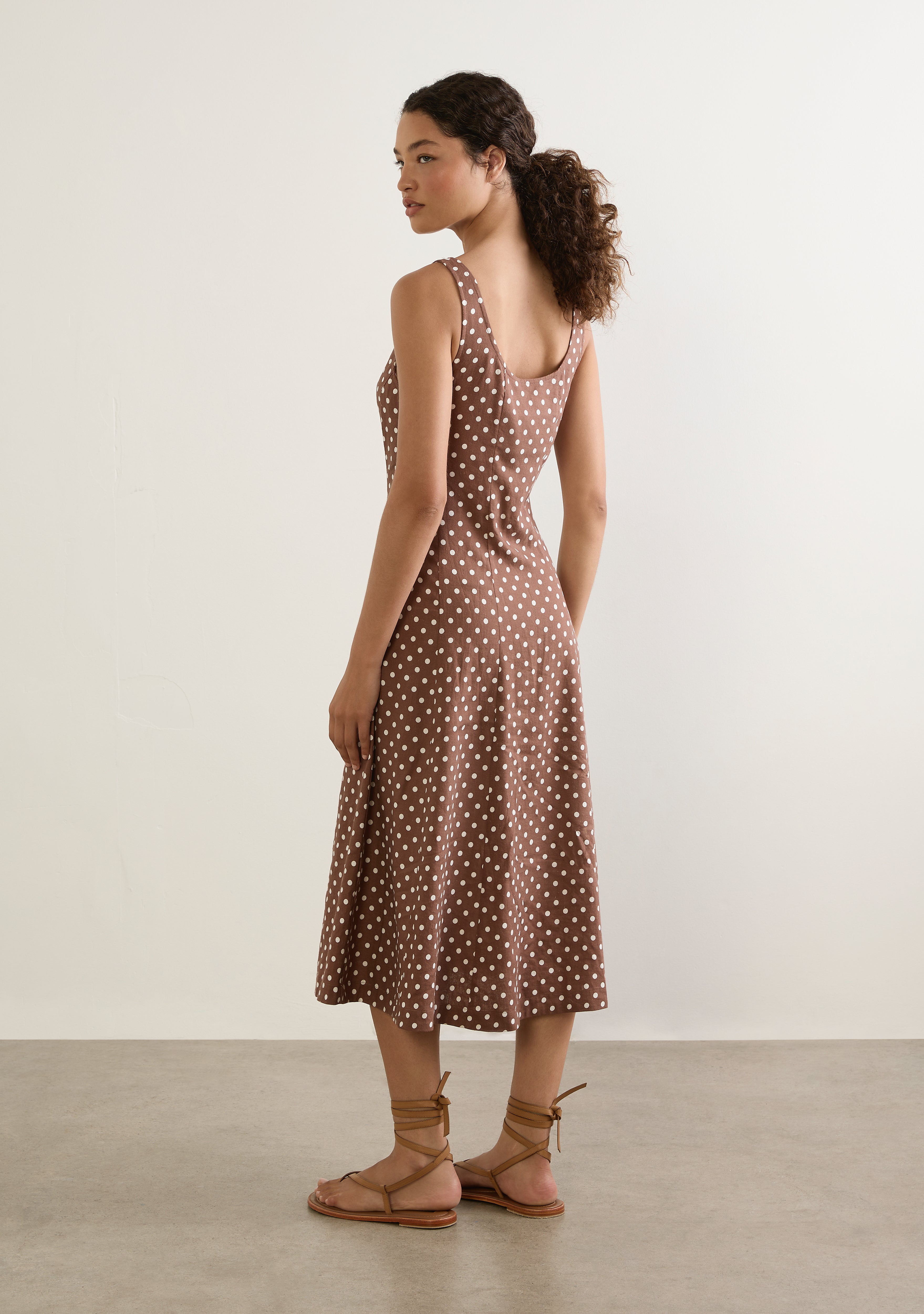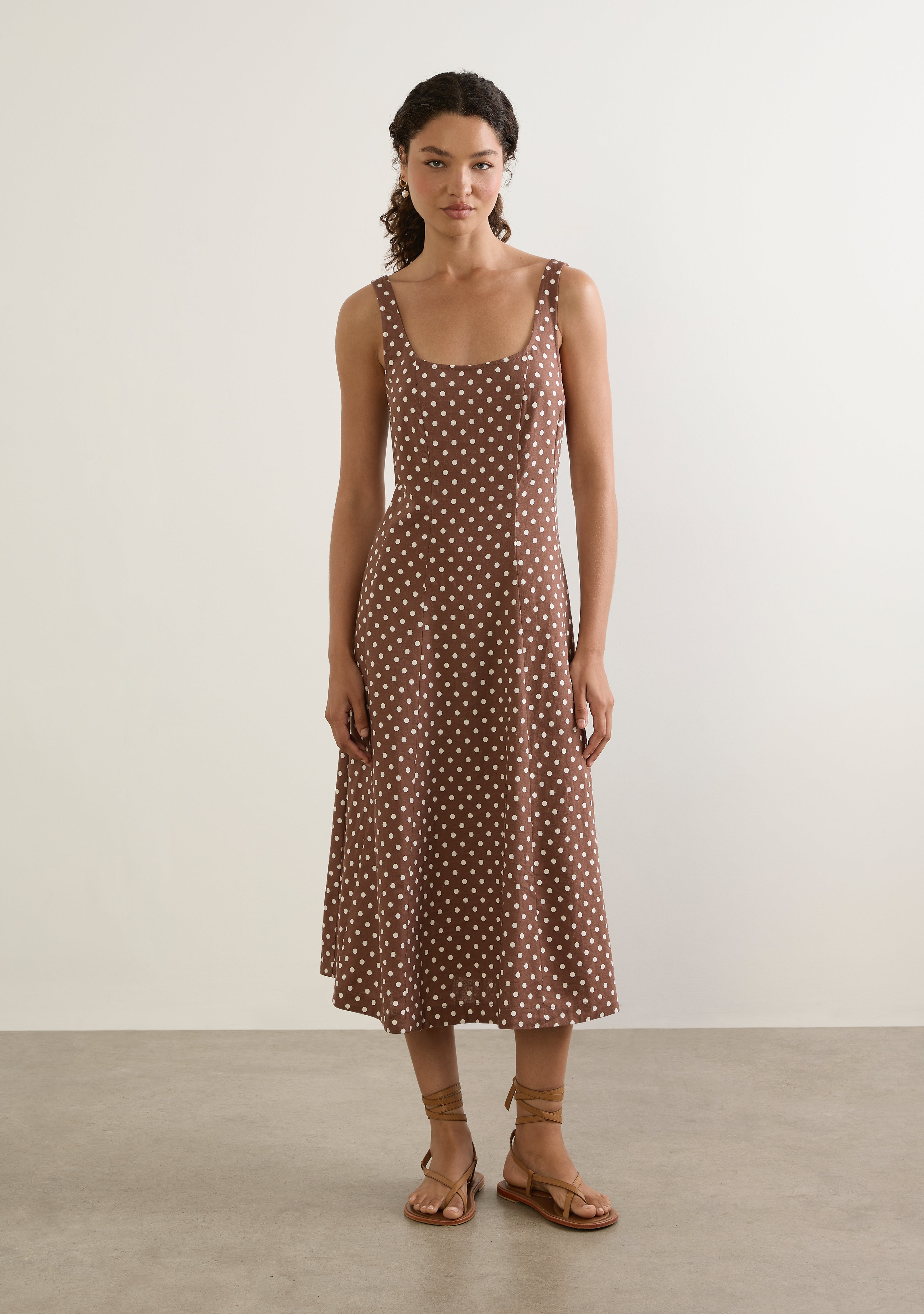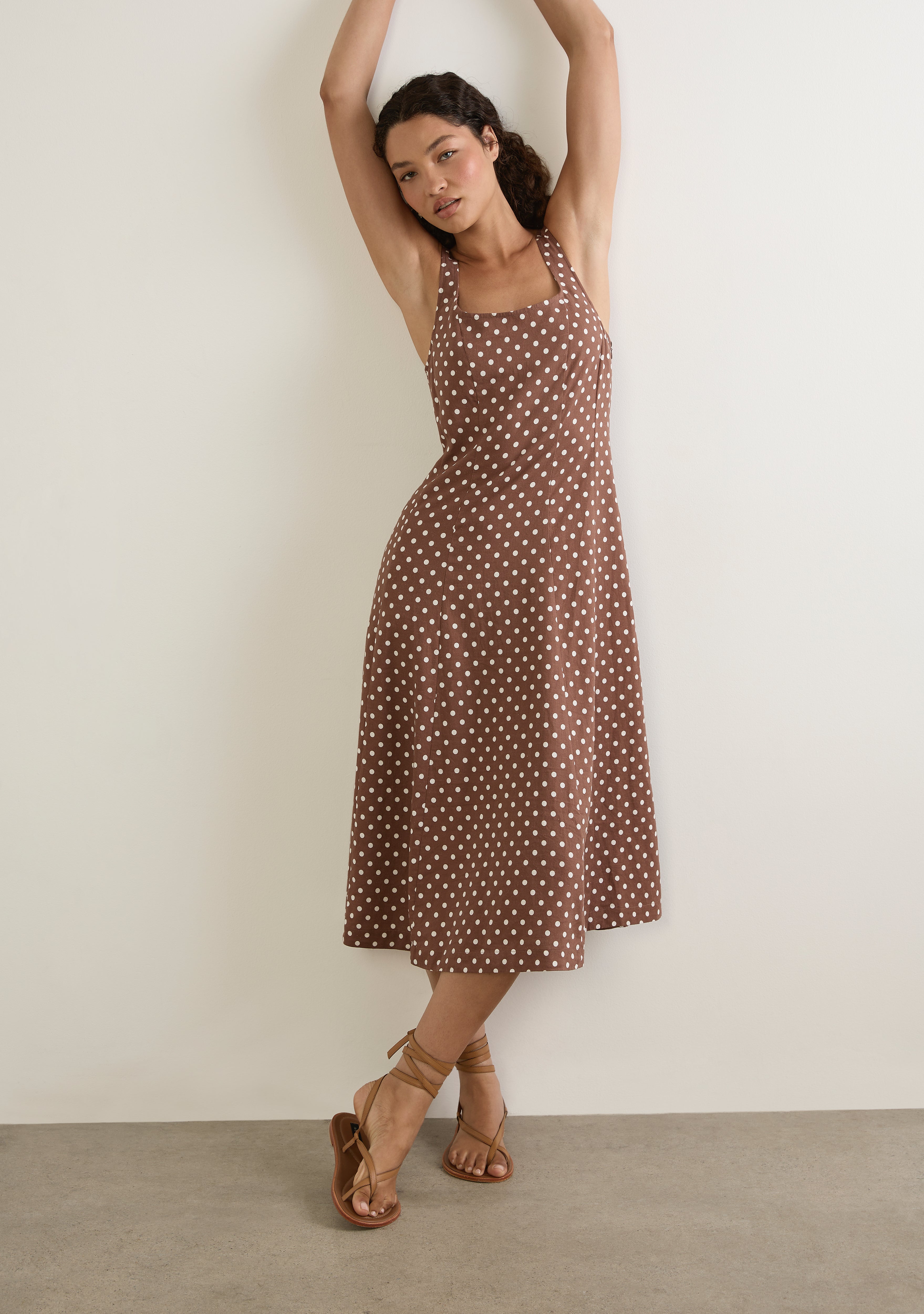 The Corinne Midi Dress channels 90s charm in a coffee based polka dot with a simple round neckline and a flattering fit-and-flare silhouette. Crafted from a linen blend with a beautiful drape, this unapologetically feminine style is made to flatter every occasion.