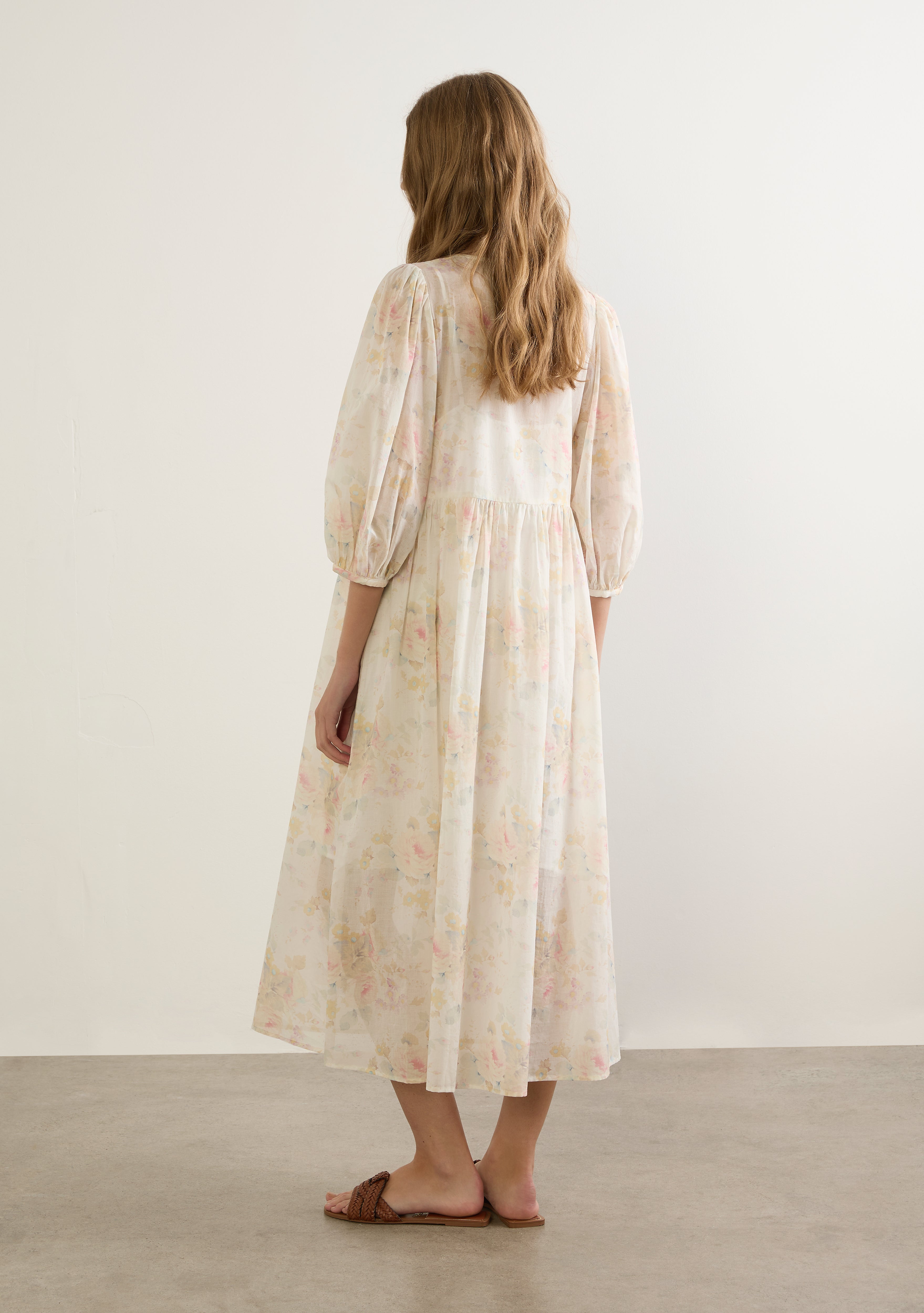 The Ellis Midi Dress in our off-white Opaline print is a timeless summer favourite, crafted from organic cotton voile. Featuring a flattering V-neckline, button-front bodice, and voluminous three-quarter sleeves, this piece is designed with soft waist gathers and an easy, relaxed fit. An effortless style that seamlessly transitions from day to evening.