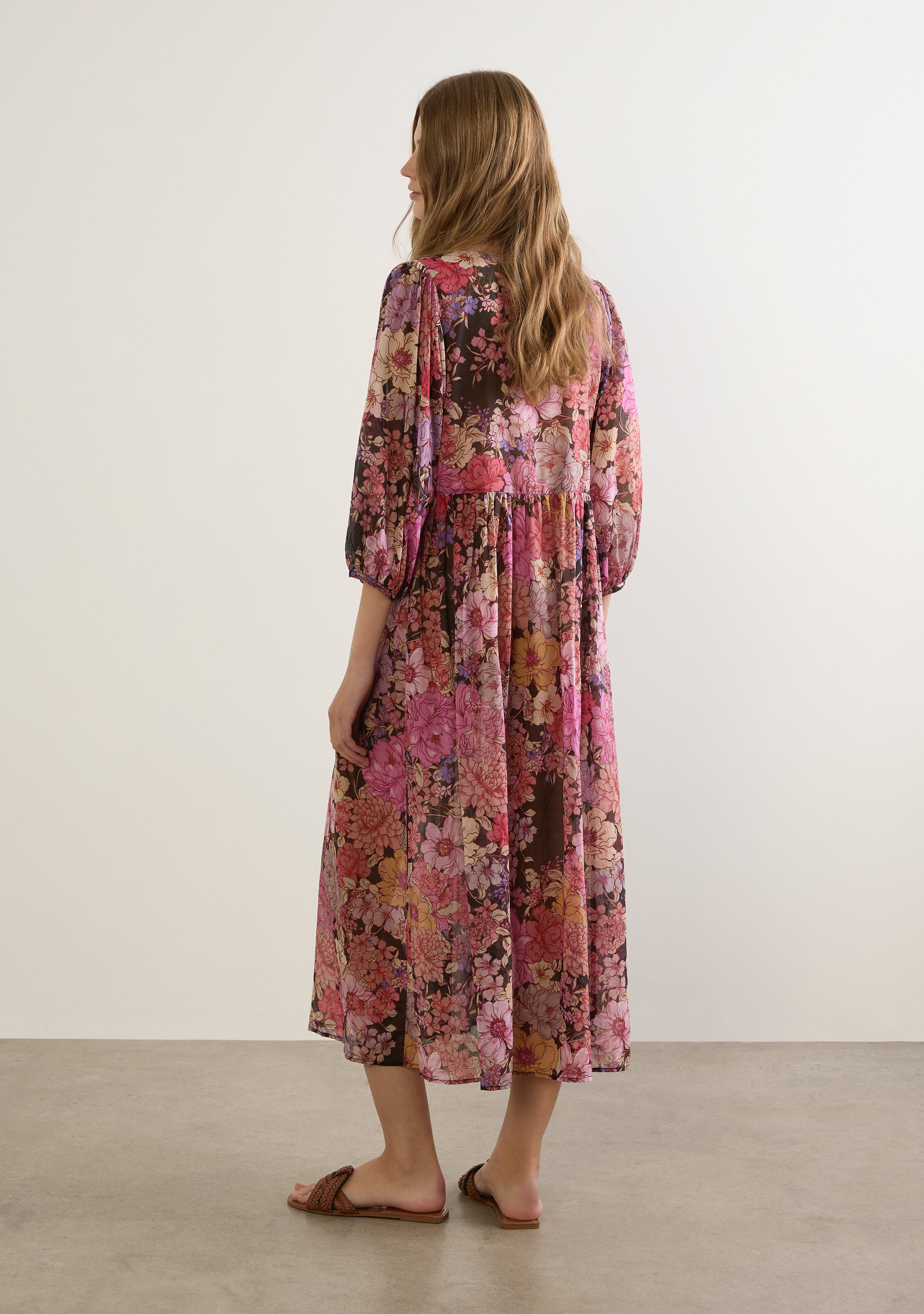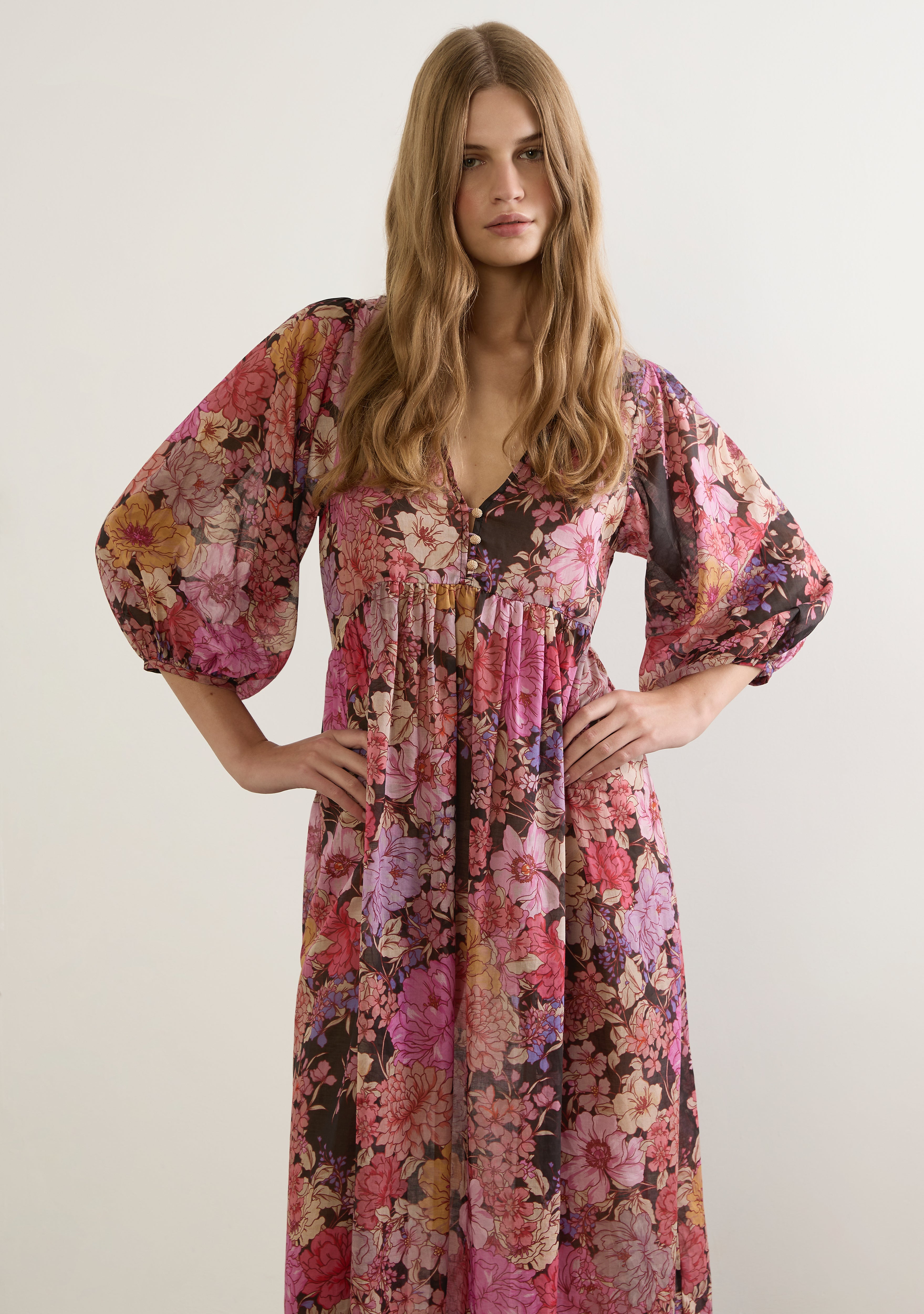 The Ellis Midi Dress in our black Ode Floral is a timeless summer favourite with a flattering V-neckline, button-front bodice, and voluminous three-quarter sleeves. Designed with soft waist gathers and an easy, relaxed fit, it’s an effortless style for day to evening.