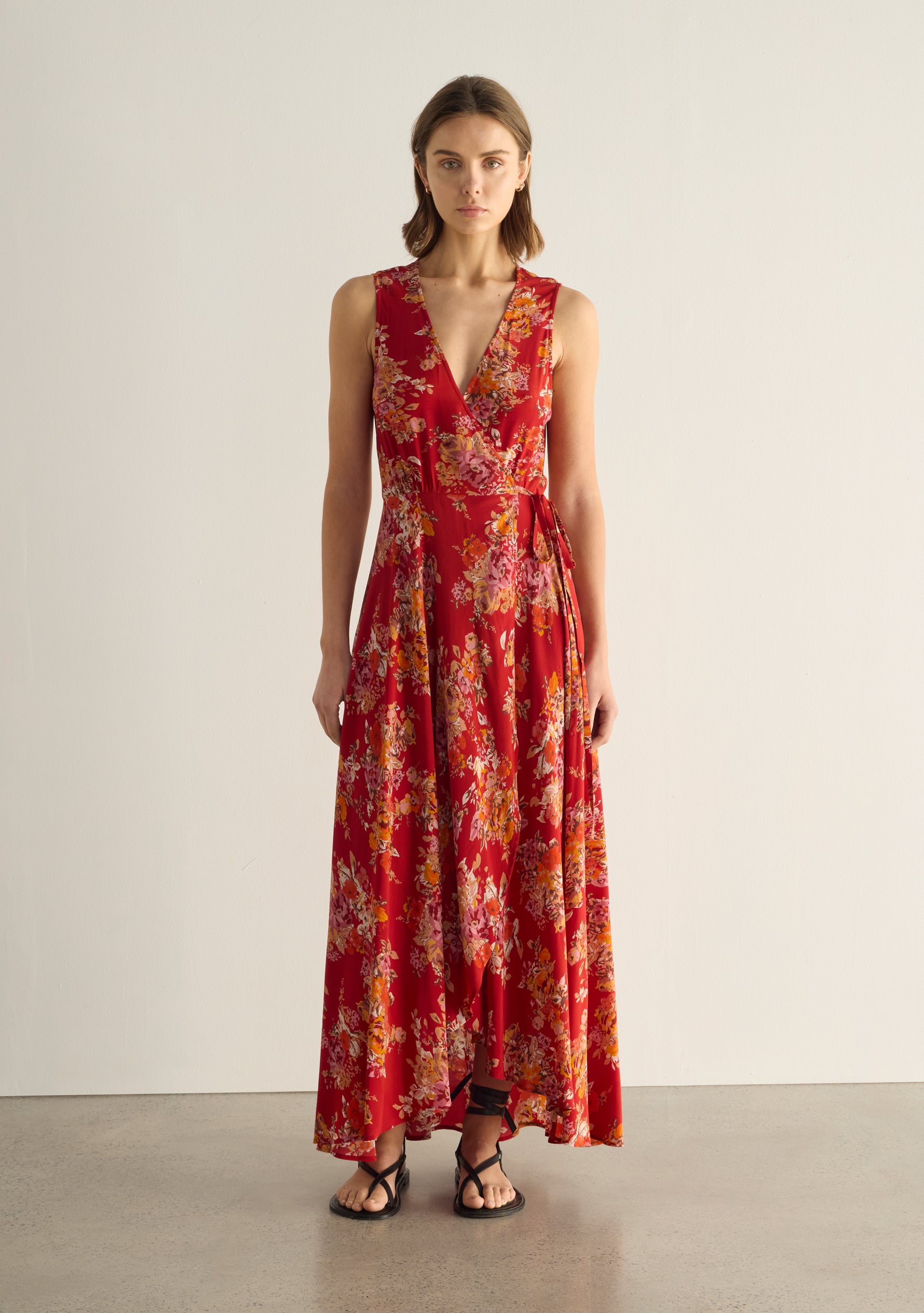 The Frida Wrap Maxi Dress—an Auguste classic—is back in our festive red Iris print, ready to turn heads. With its functional wrap design flowing into a full, voluminous maxi skirt, this standout piece will have you floating through summer with your feet off the ground—cue the compliments.