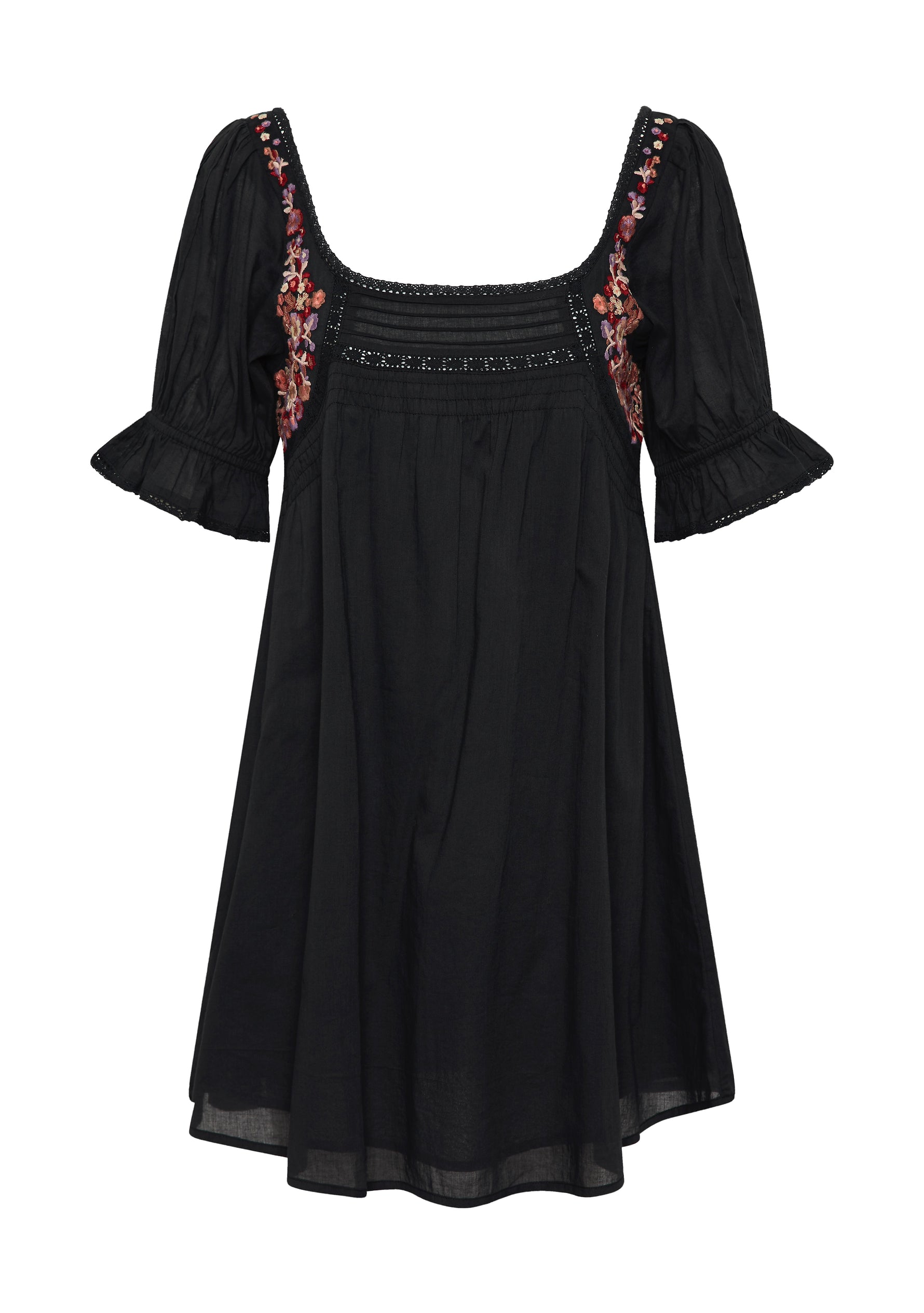 The Lana Mini Dress in black is a sweet bohemian-inspired summer staple, adorned with warm-toned hand embroidery, lace trims, and short puff sleeves with frilled cuffs. With pintucks, soft shirring, and a floaty silhouette, it’s effortlessly feminine for sunshine days and warm nights.