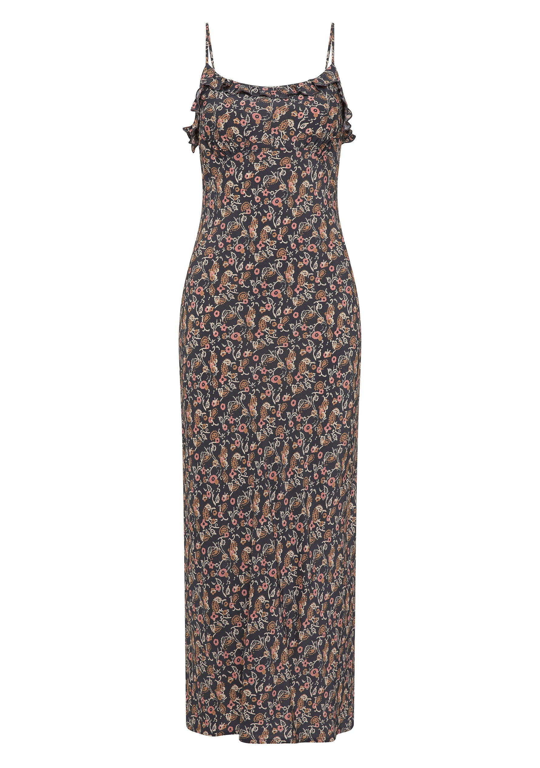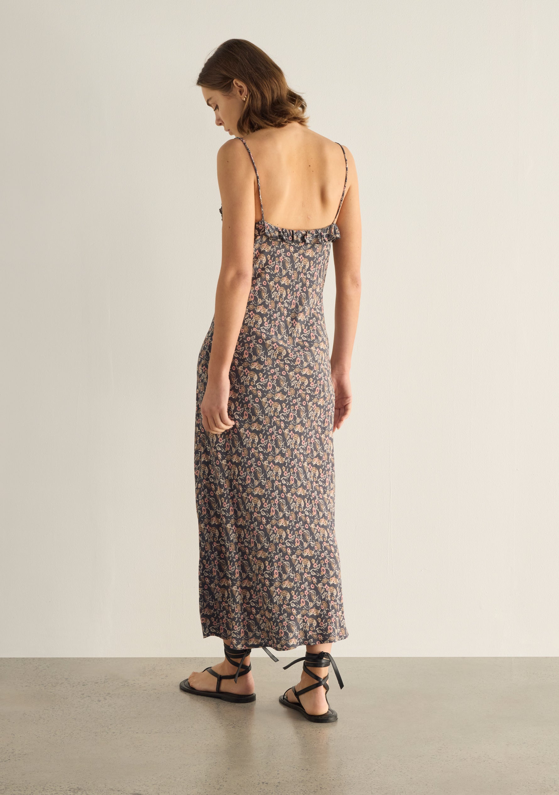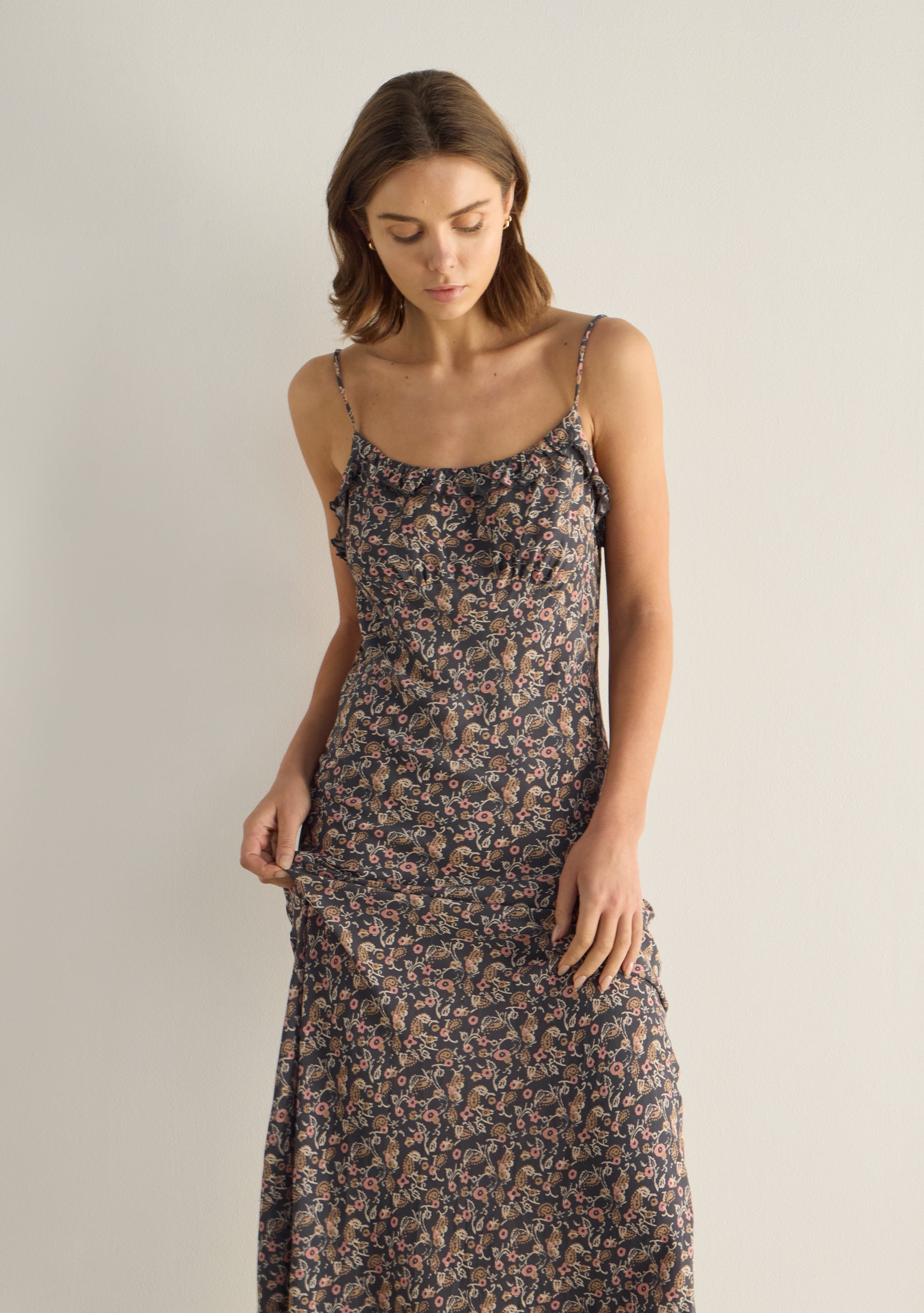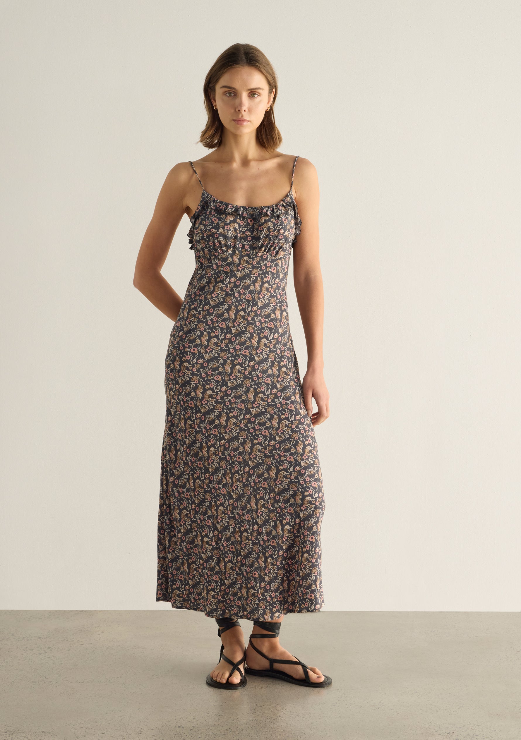 The Liss Midi Dress in our striking charcoal Sonder print is an event-ready standout. Featuring a scoop neckline with delicate ruffle detailing, fixed straps, and a softly gathered bust, it skims the body with a flattering bias-cut silhouette that falls to a beautifully draped hem—cue the compliments.