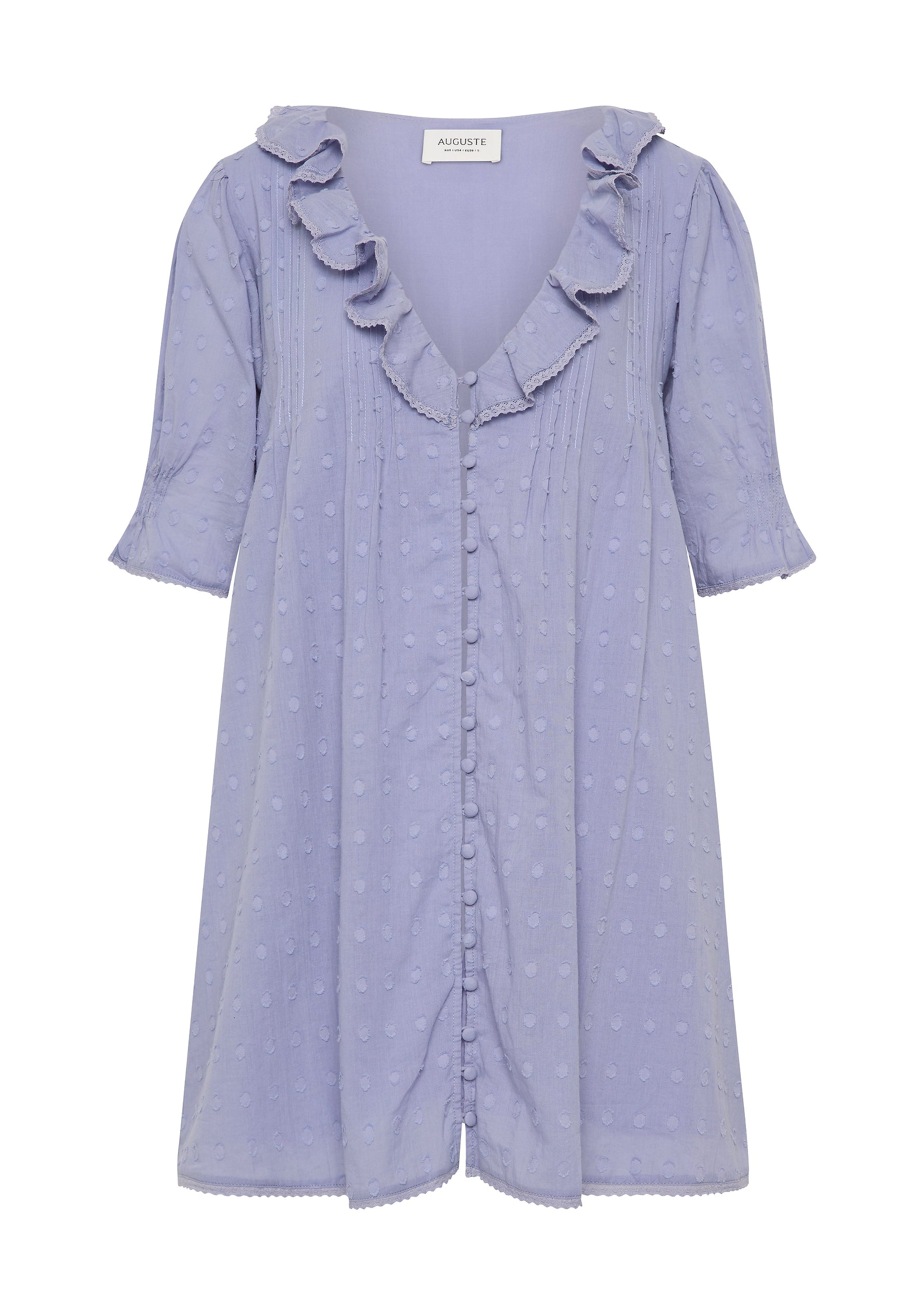 The Rafael Mini in our Hydrangea Blue textured polka-dot cotton is set to be your summer staple. No detail has been spared—ruffled collar, delicate trim, and pin-tuck accents—crafted into a flattering shift-style shirt dress that feels effortlessly timeless and feminine.