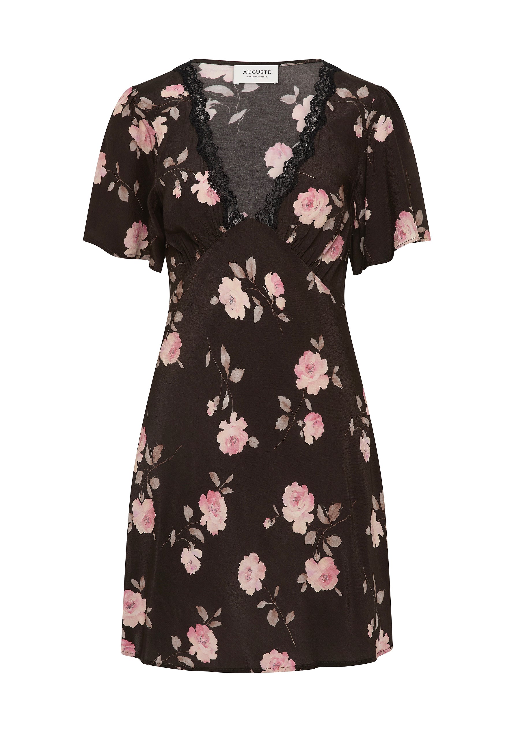 The Sadie Mini Dress in our striking charcoal Nova print brings a touch of ’90s nostalgia to a playful mini length. With a lace-trimmed neckline, soft under-bust gathers, and flutter sleeves, it’s cut on the bias to skim the body beautifully—effortless, feminine, and endlessly wearable.
