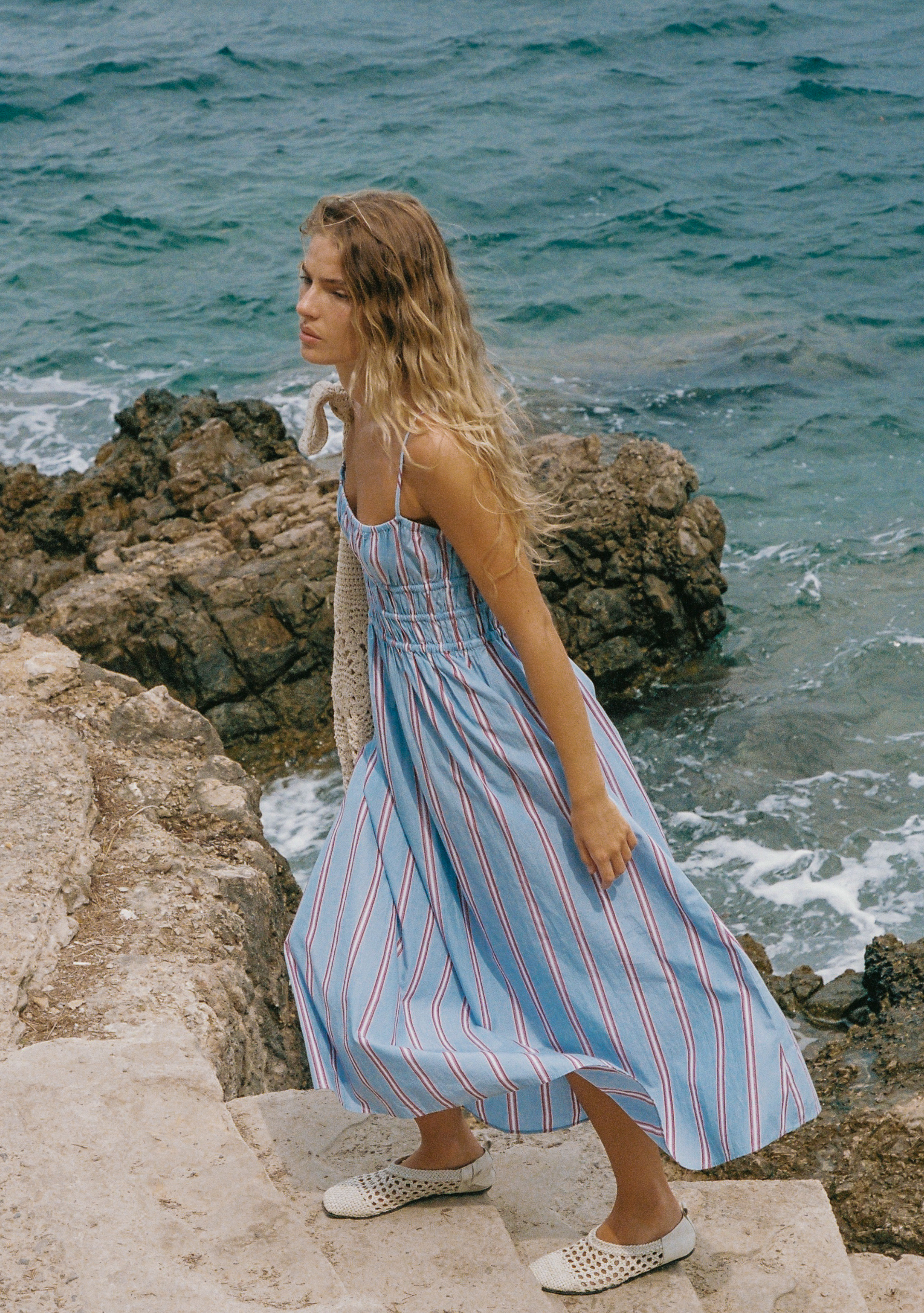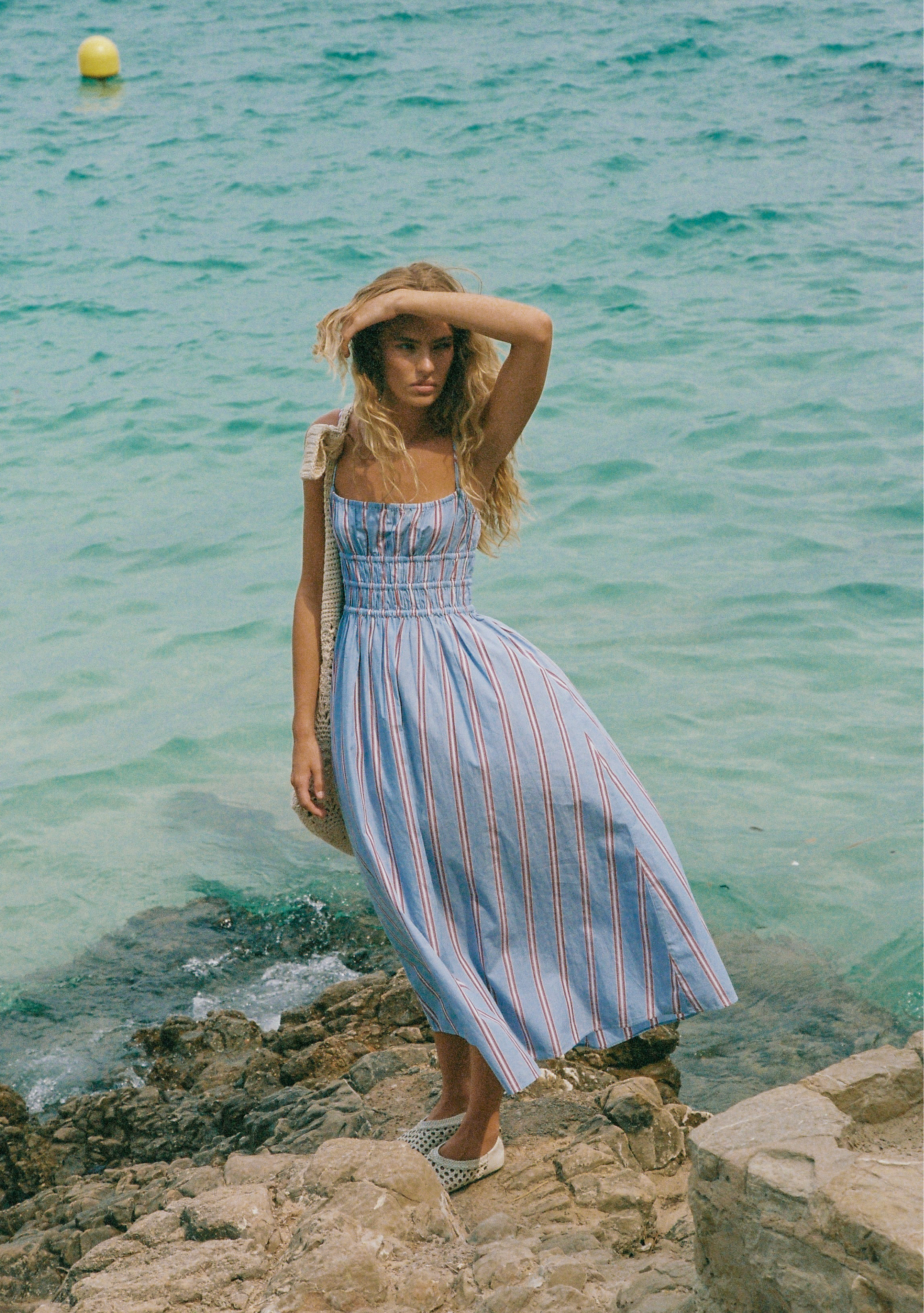 The Shivani Midi Dress in powder blue with red and white pinstripes is a classic summer silhouette. Crafted from a soft yet crisp woven cotton stripe, it features a flattering cinched waist that falls into a voluminous full skirt with thick hem detailing — a timeless piece made for sunshine days.