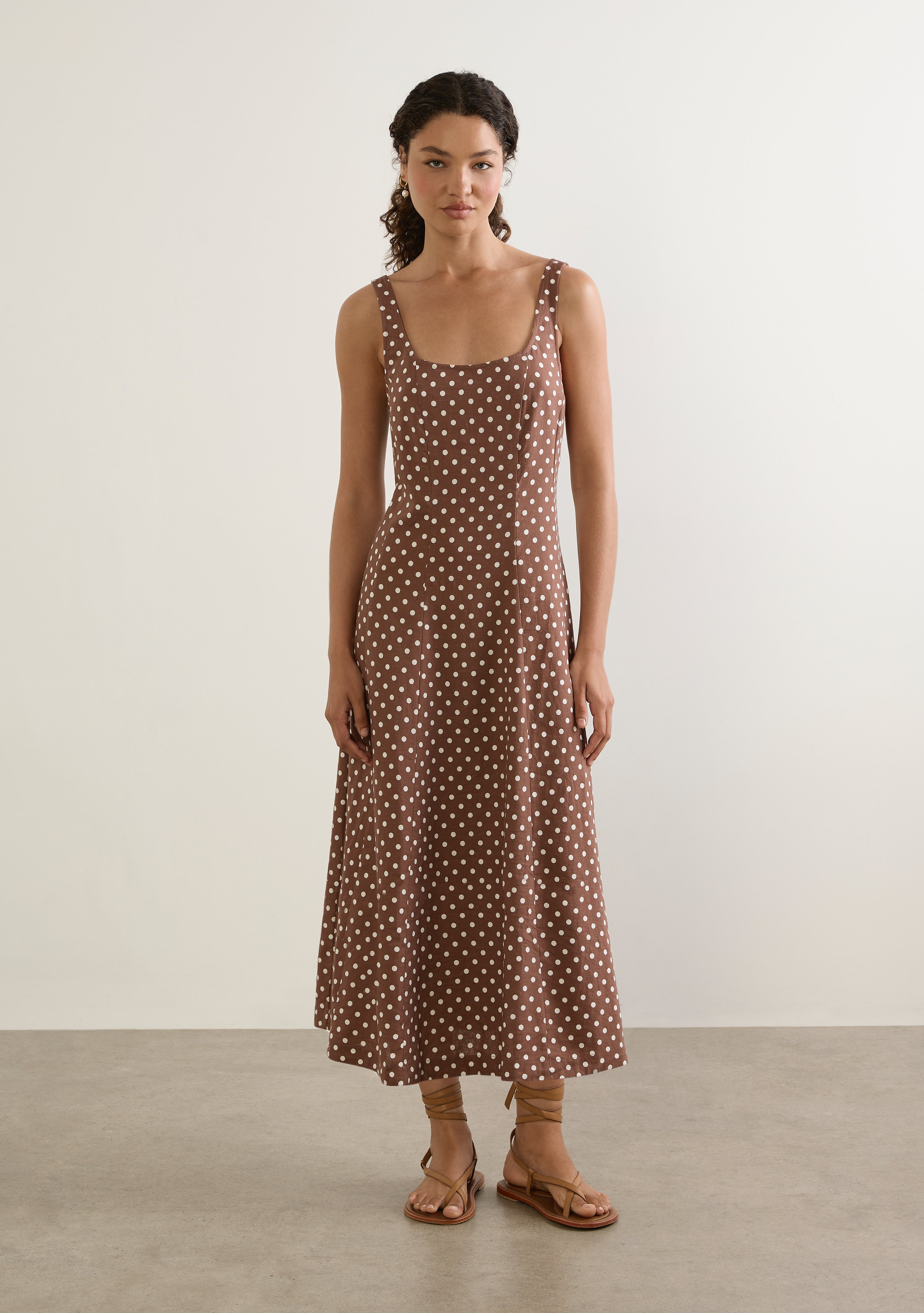 The Corinne Midi Dress channels 90s charm in a coffee based polka dot with a simple round neckline and a flattering fit-and-flare silhouette. Crafted from a linen blend with a beautiful drape, this unapologetically feminine style is made to flatter every occasion.