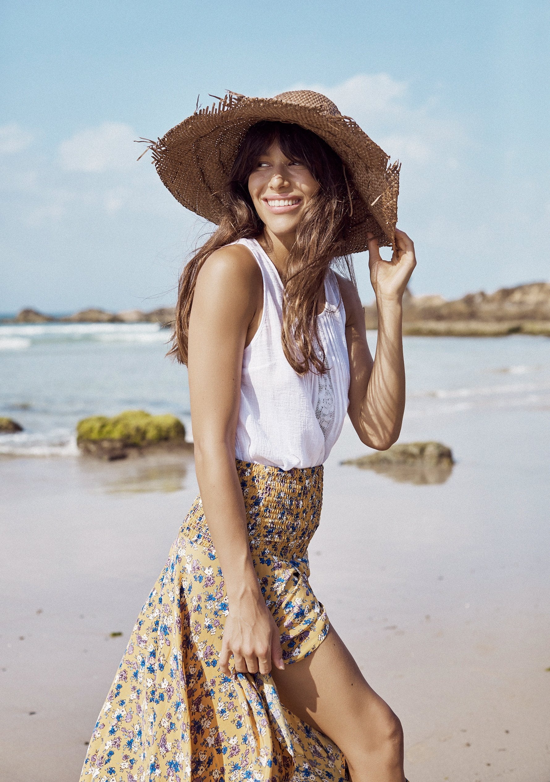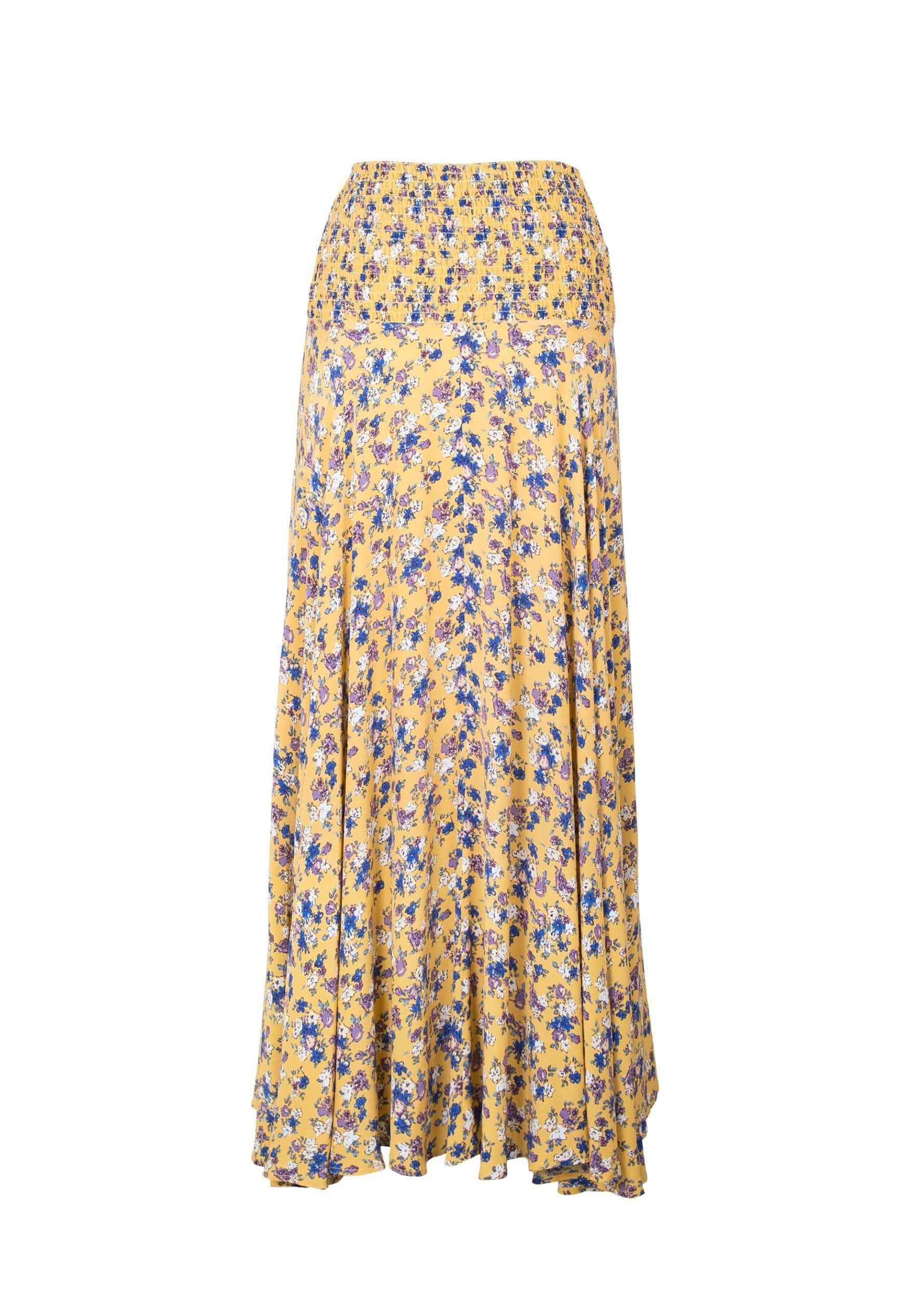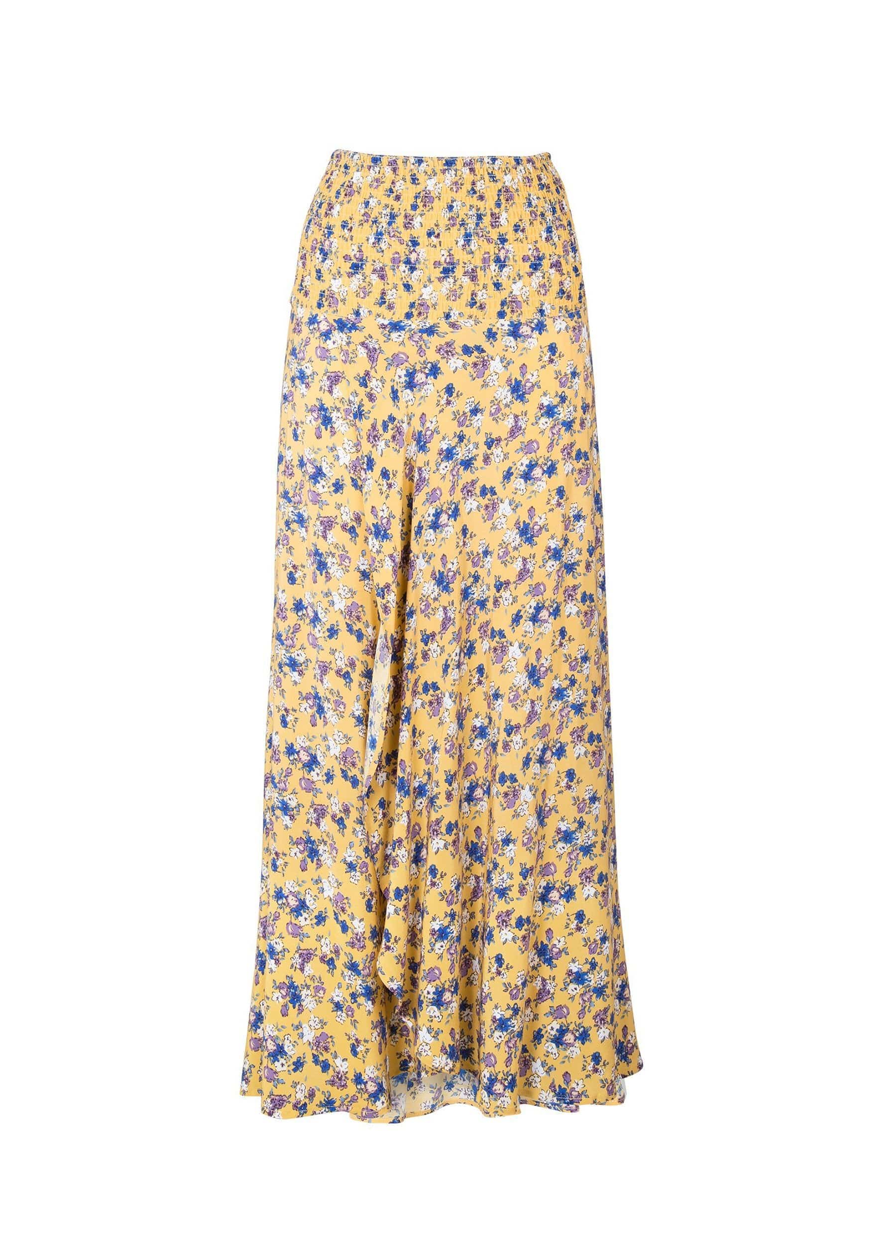 A shirred-waist maxi skirt featuring a flowing faux wrap design and a voluminous circular shape for a beautifully feminine silhouette made from natural viscose rayon.