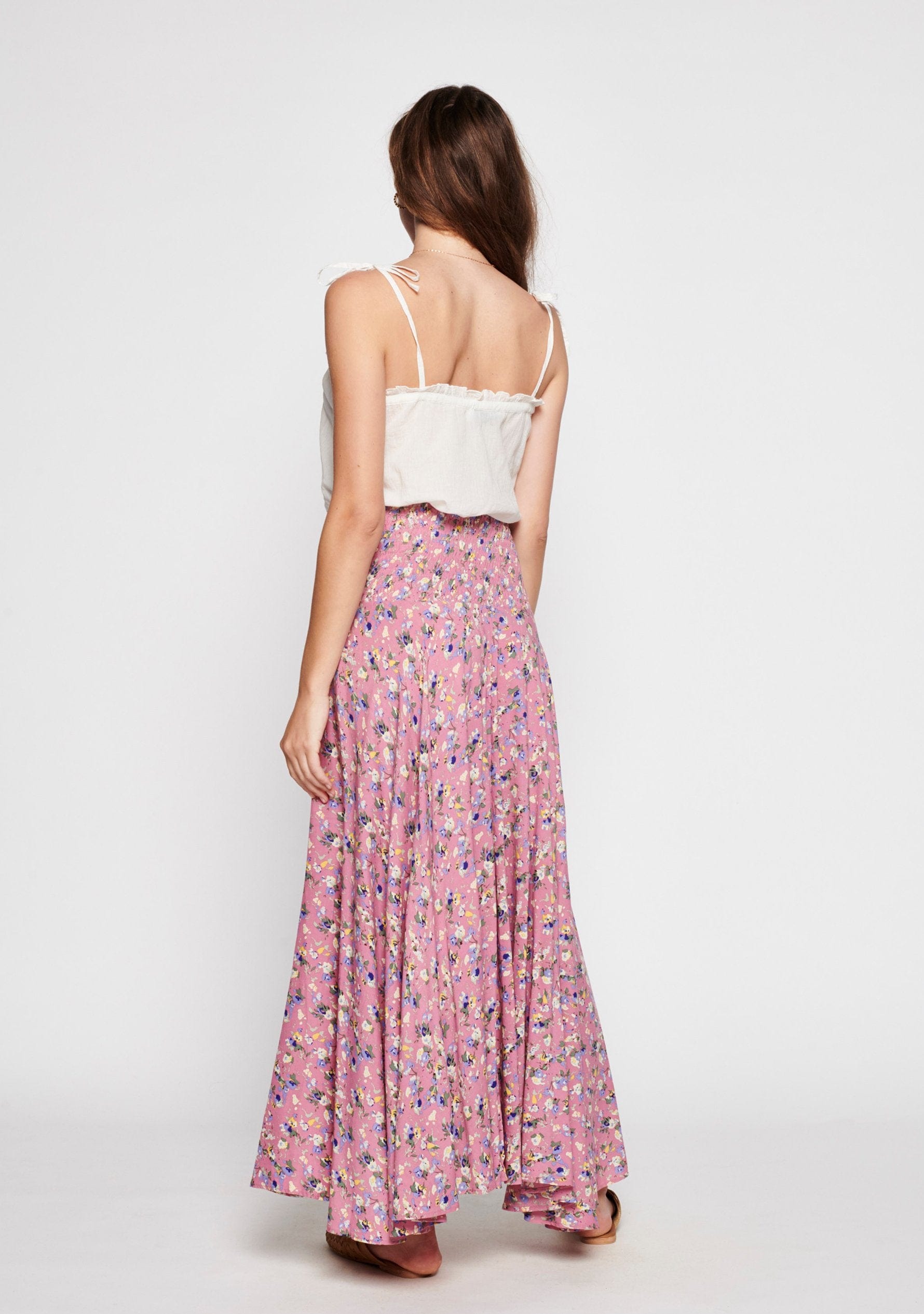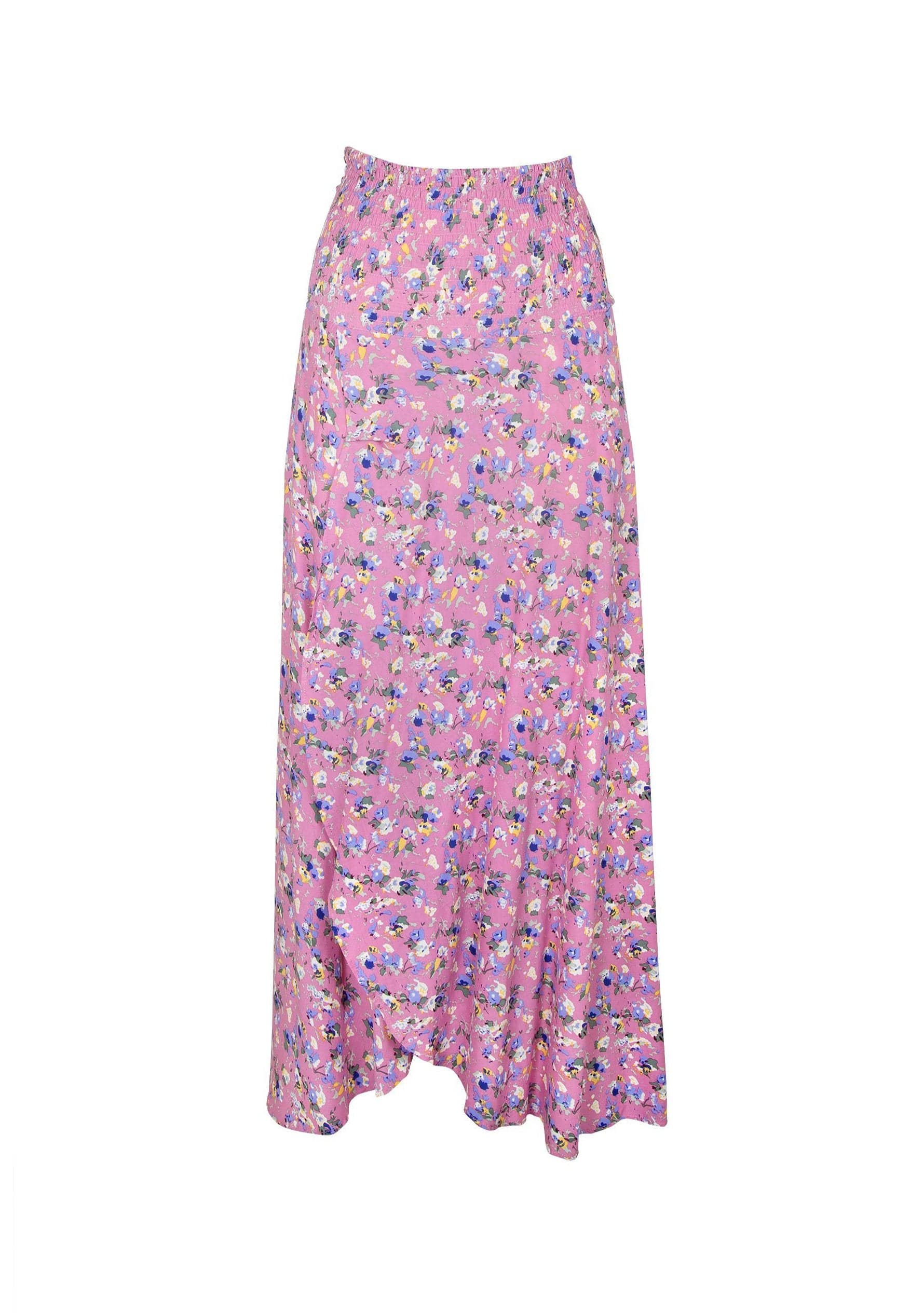 A shirred-waist maxi skirt featuring a flowing faux wrap design and a voluminous circular shape for a beautifully feminine silhouette made from soft rayon.