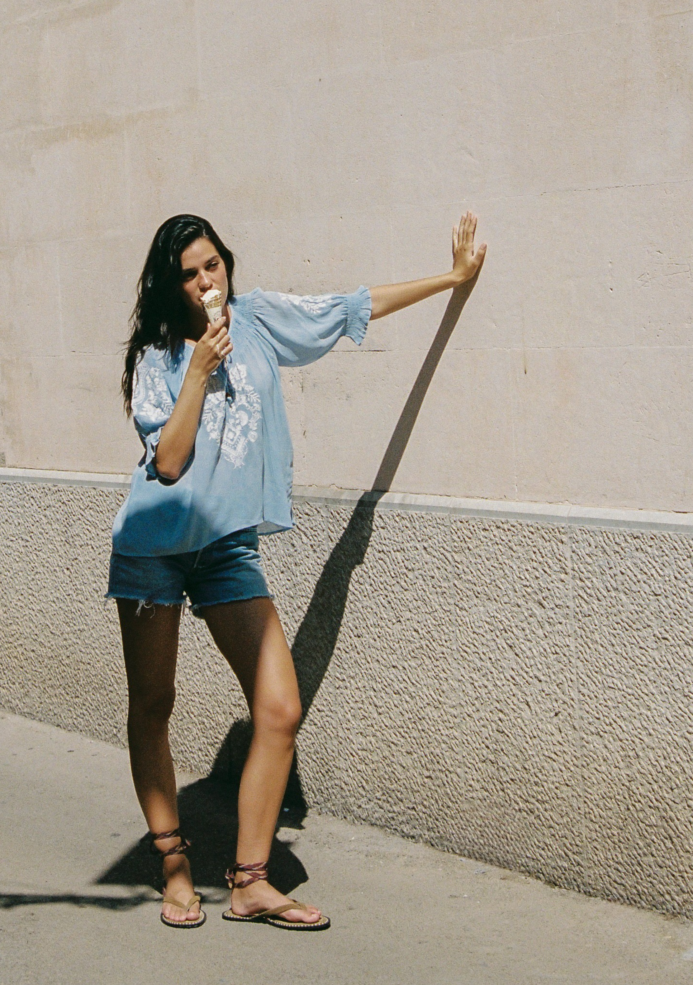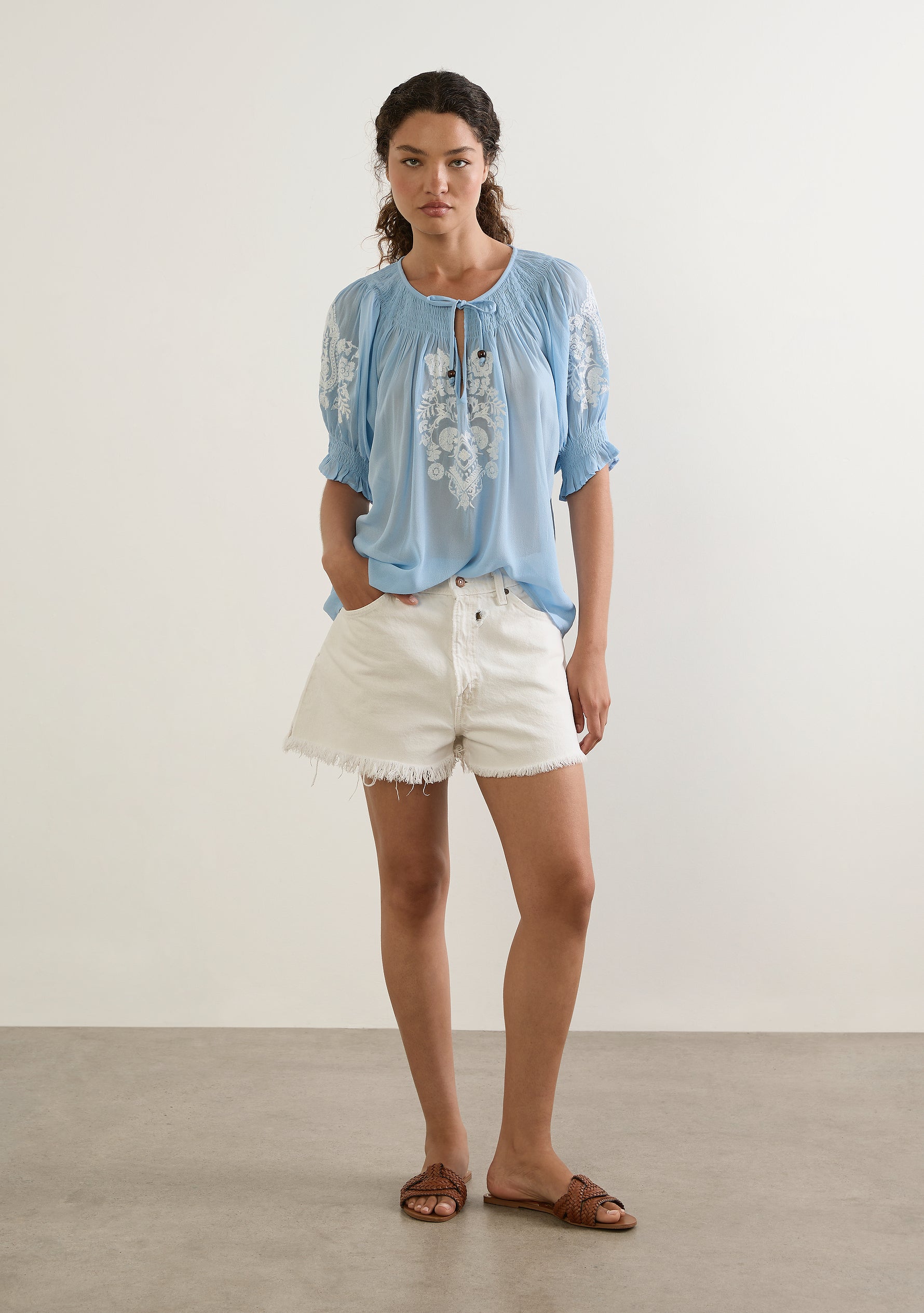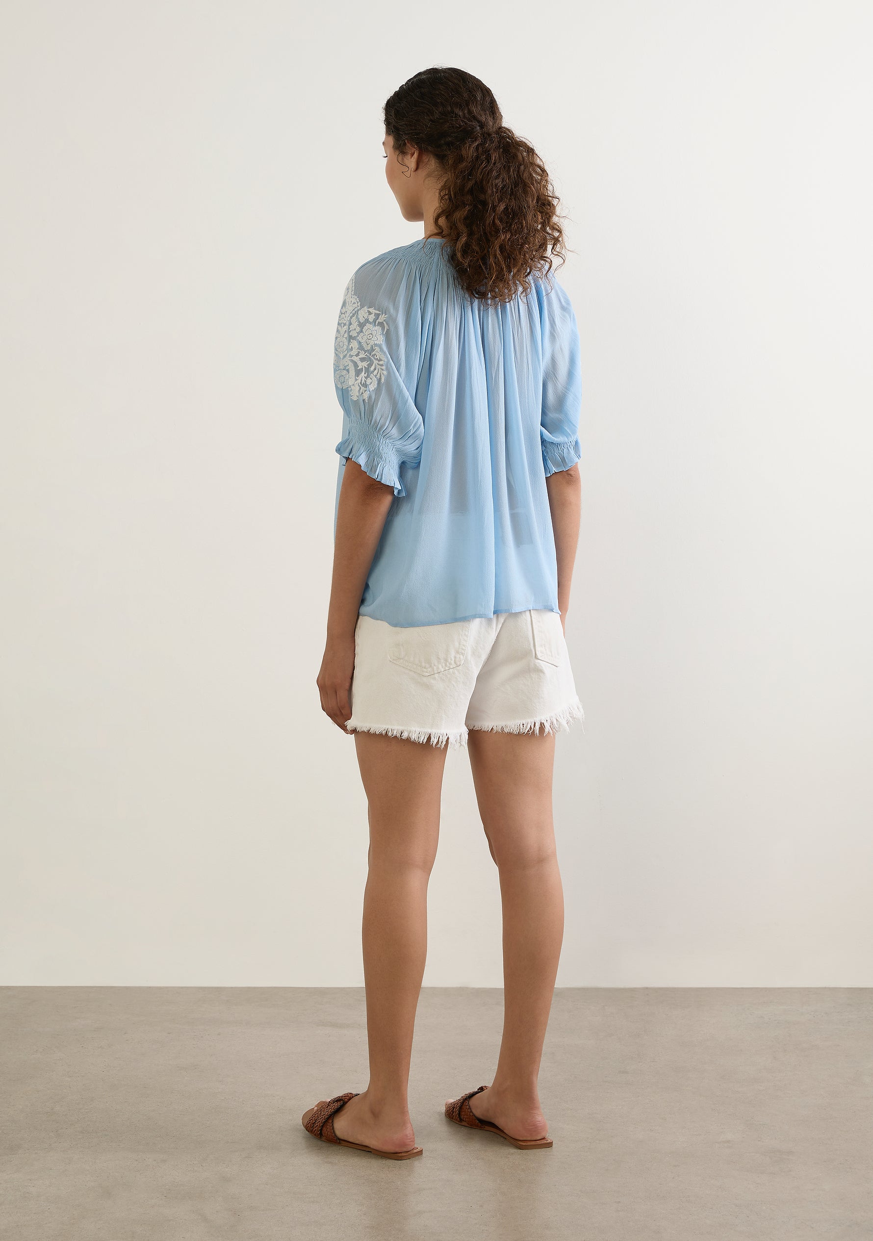 The Indra Embroidered Blouse in powder blue is a dreamy artisan piece, adorned with contrast white hand embroidery. Designed with a V-neckline and optional tie, soft shirring, and raglan puff sleeves finished with elastic cuffs, this semi-sheer georgette style is effortlessly feminine — it’s your denim’s new best friend.