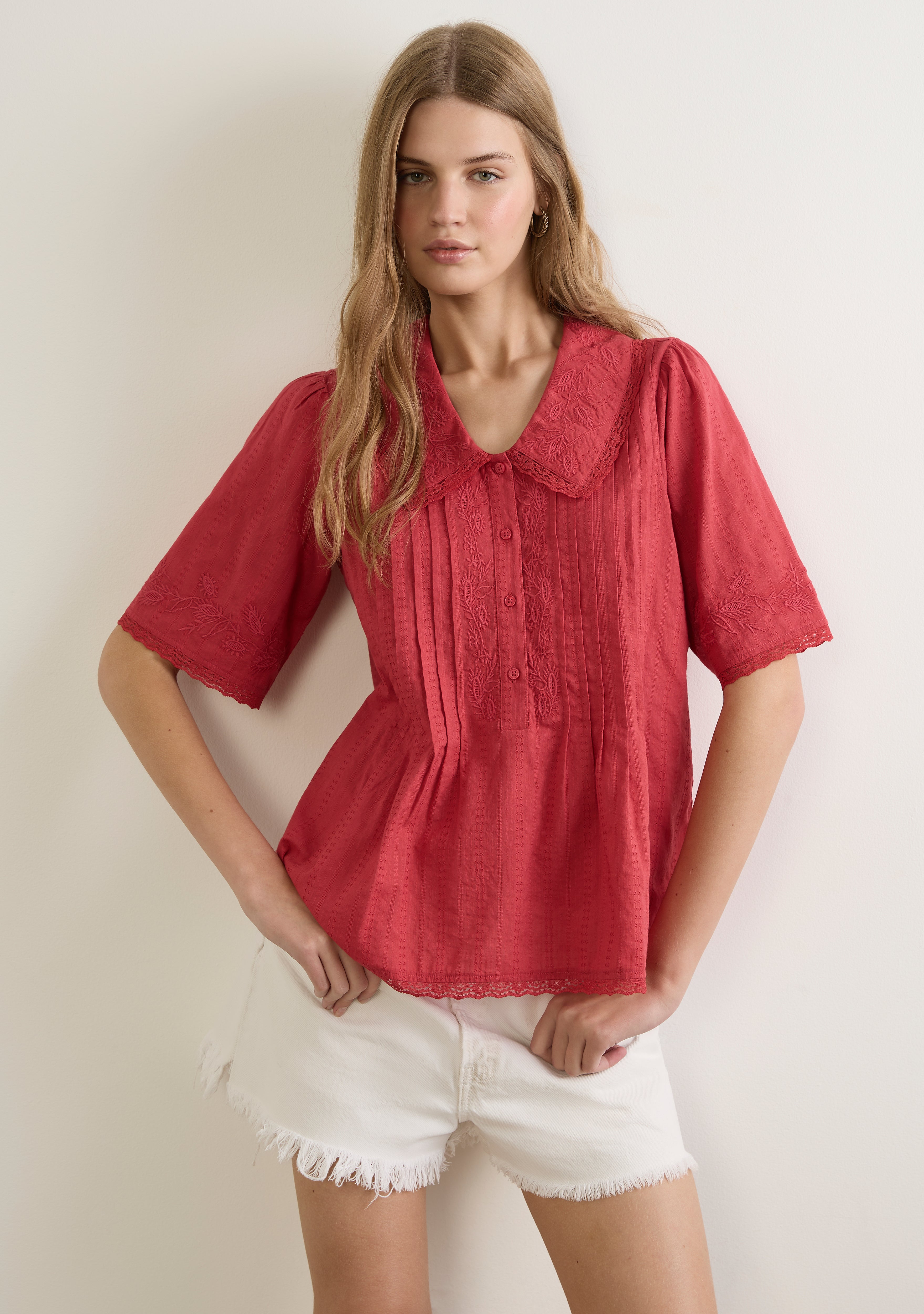 No detail is spared in the Lennon Blouse in vibrant festive red. Crafted from soft textured cotton, it features a Peter Pan collar with lace trim, short sleeves with delicate lace, and tone-on-tone embroidery with pintuck detailing throughout. A beautifully crafted piece — and your denim’s new best friend.