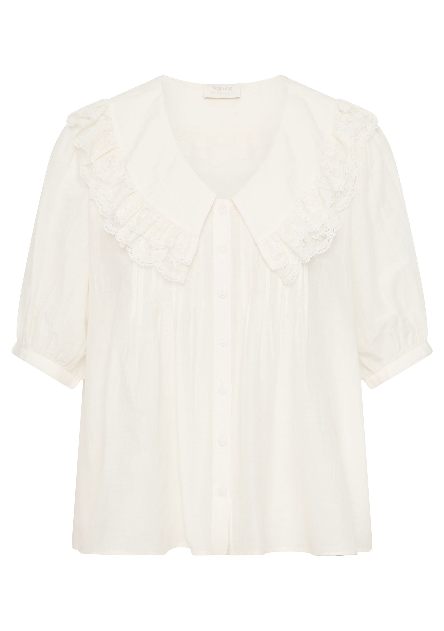 The Otis Blouse in warm white brings vintage charm to everyday dressing, featuring a lace-trimmed ruffle collar, delicate pintuck accents, and softly puffed sleeves with button cuffs. Effortlessly feminine with a relaxed fit, it’s a timeless summer piece — it’s your denim’s new best friend.
