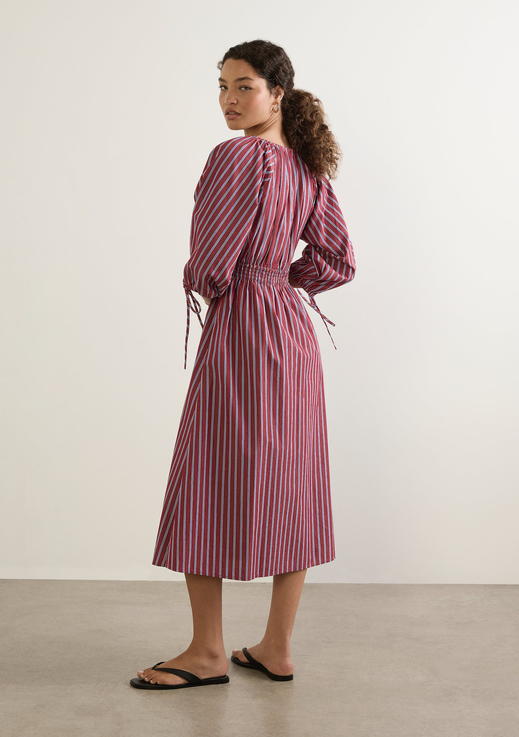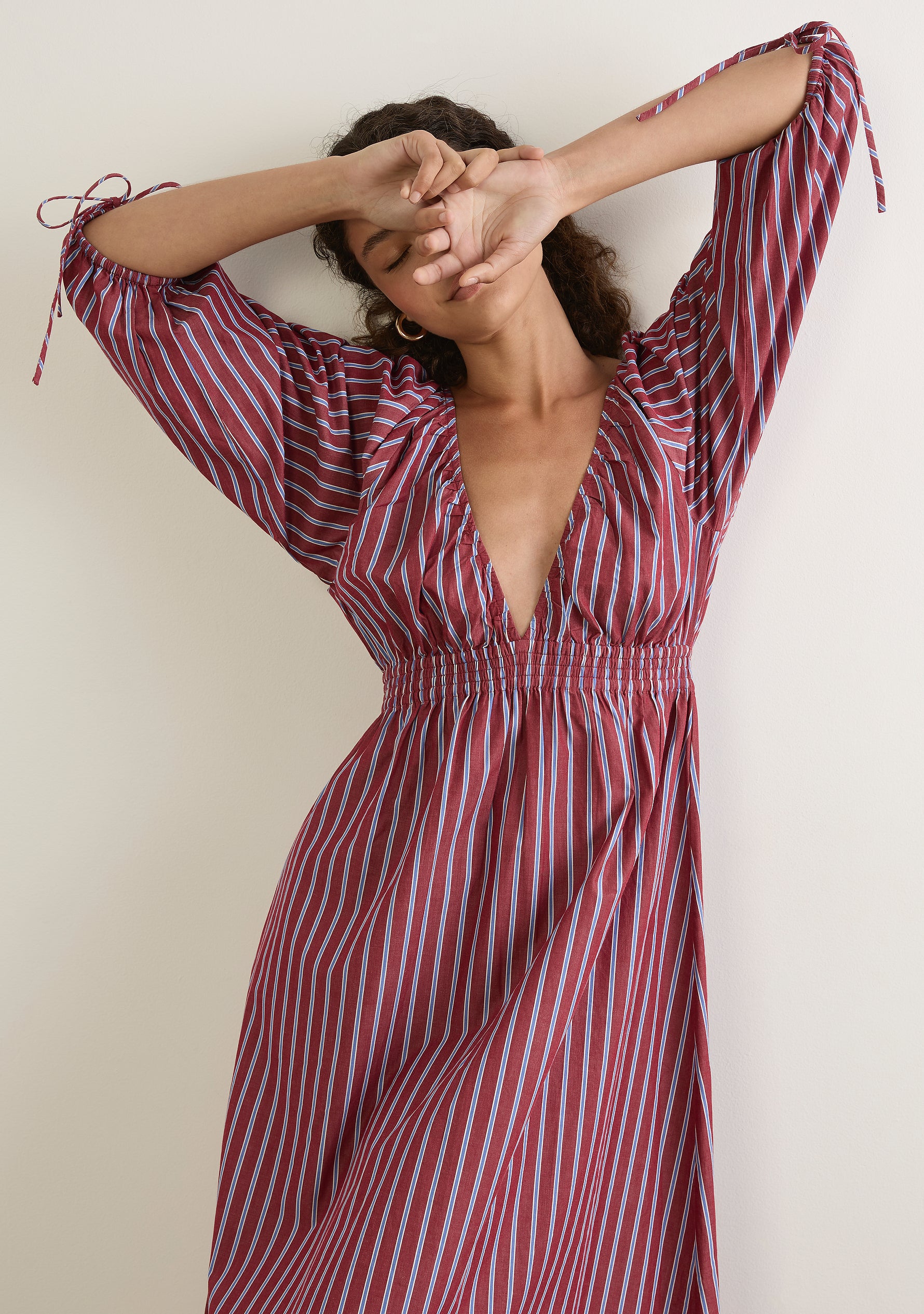 The Alaiyah Midi Dress in washed-back red with blue and white woven pinstripes is a timeless summer statement. Featuring a deep V-neckline with soft gathers, ¾ raglan sleeves with elastic cuffs and drawcords, and an elasticated under bust, it flatters with a cinched waist that falls into a voluminous skirt. Effortlessly feminine and endlessly versatile, this dress is made for sunshine days and summer nights.