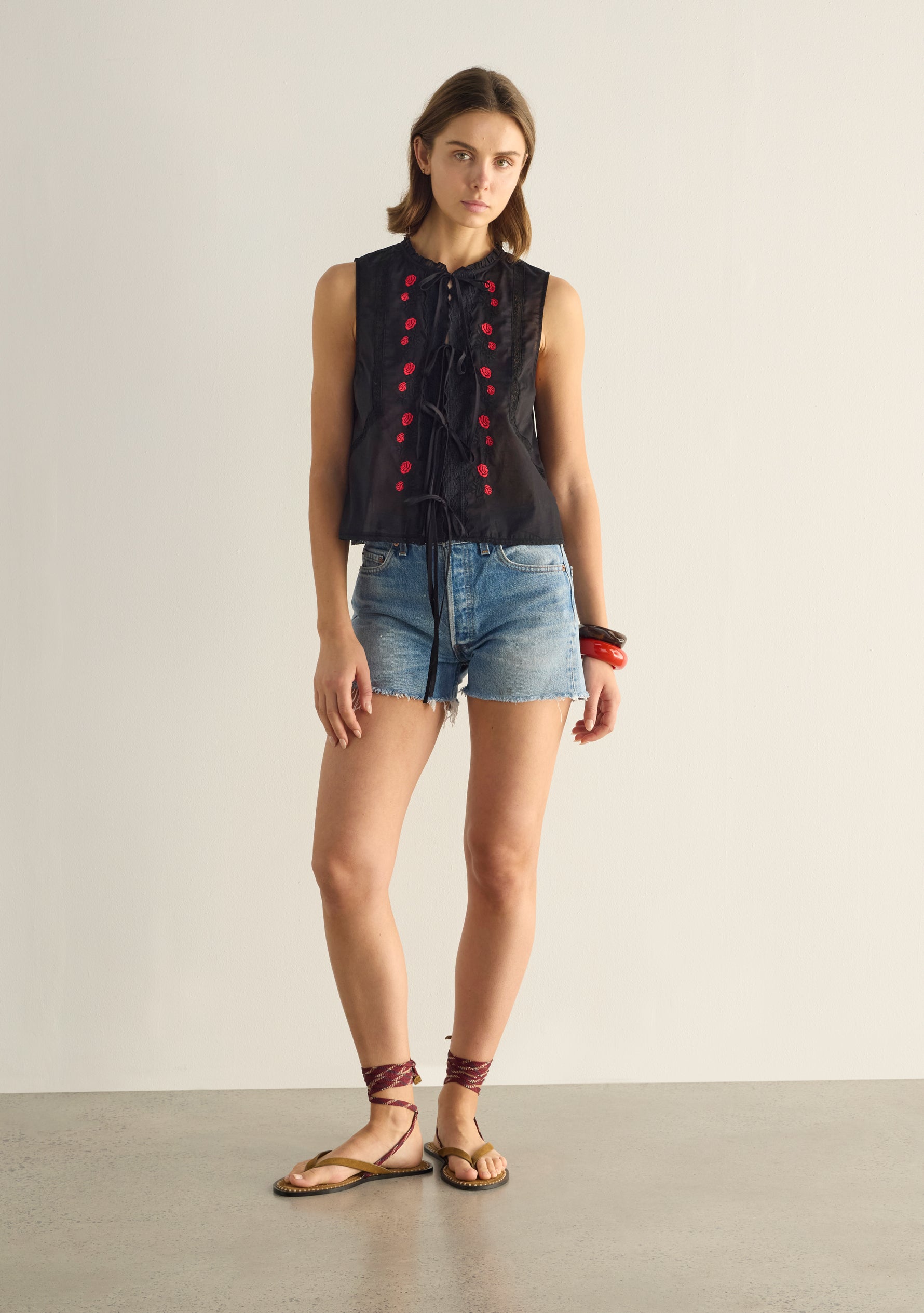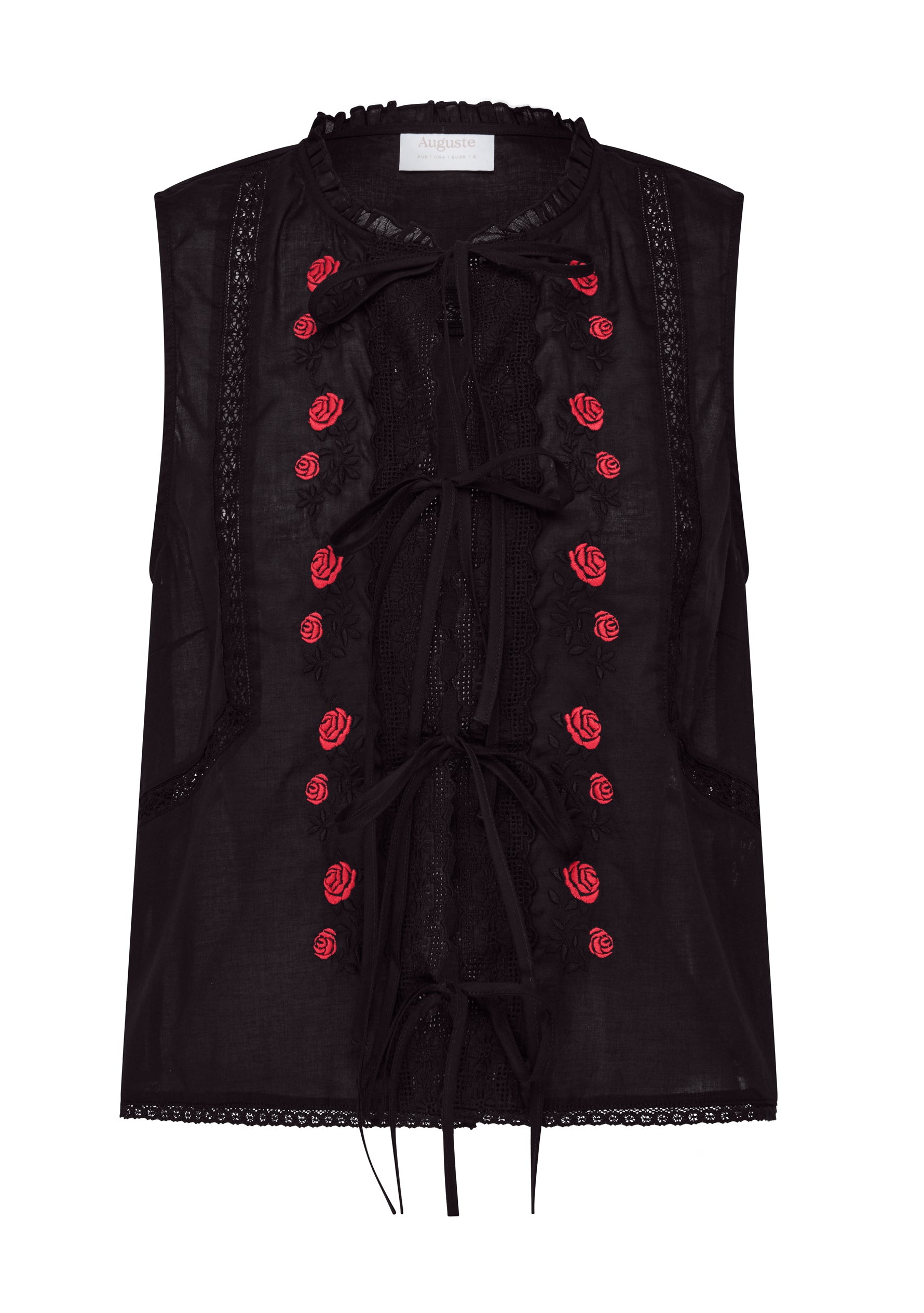 The Bellamy Embroidered Blouse in black, with contrast hand-embroidered red roses, is your denim’s new best friend. In a super-flattering tank silhouette, no detail has been spared—intricate embroidery, delicate pin tucks, lace touches, and functional ties—crafted from deliciously soft organic cotton. A sweet, artisanal piece made to brighten every warm day.