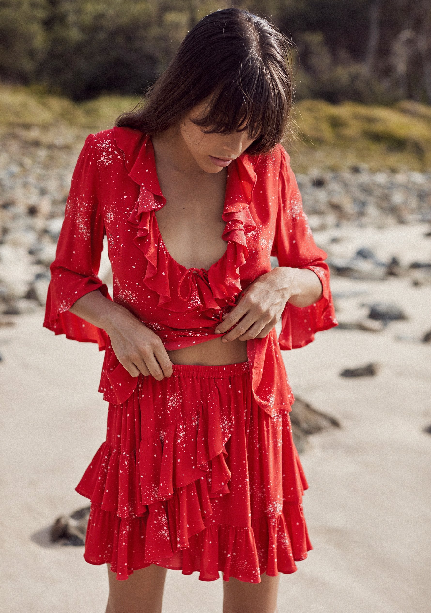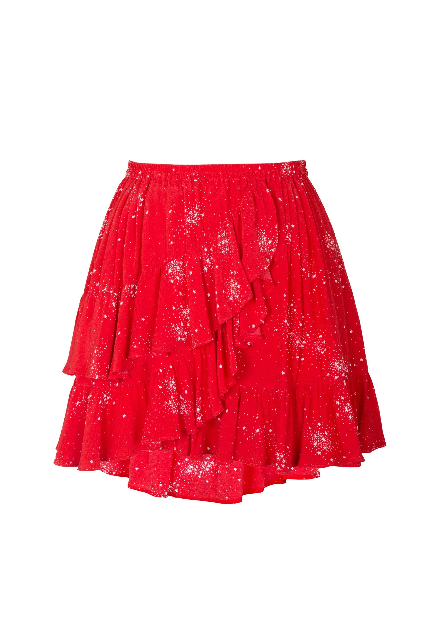 An elasticated-waist mini skirt crafted from a natural viscose–rayon blend, designed with soft gathers from the waist and finished with playful ruffle detailing for a sweet, feminine look.