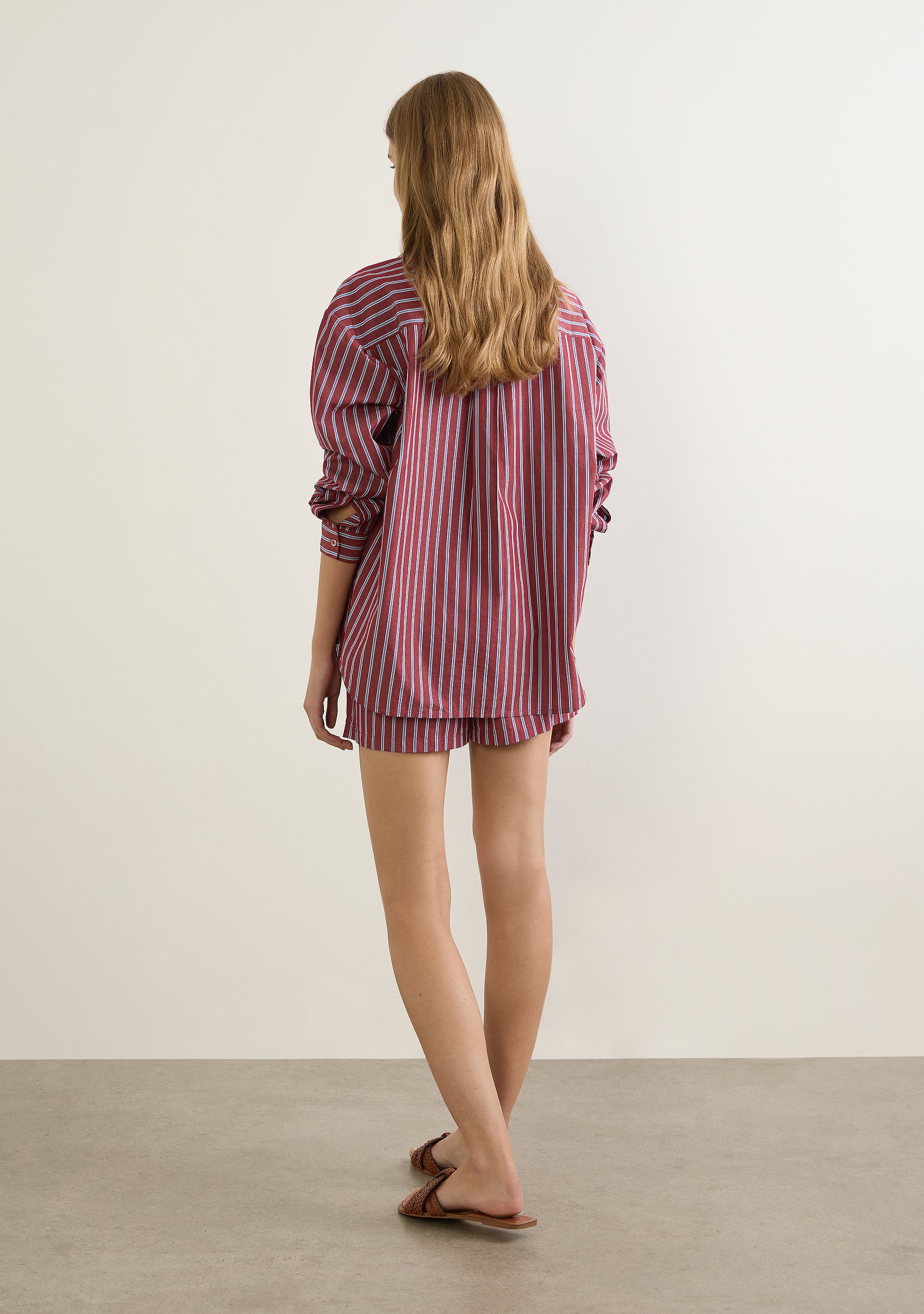 The Joe Shorts in washed-back red with blue and white woven pinstripes are a laidback essential for warm-weather dressing. Designed with an elasticated waistband and functional drawcord for all-day comfort, they’re crafted from 100% cotton and pair perfectly with the matching Lucien Shirt for a relaxed yet elevated summer set.
