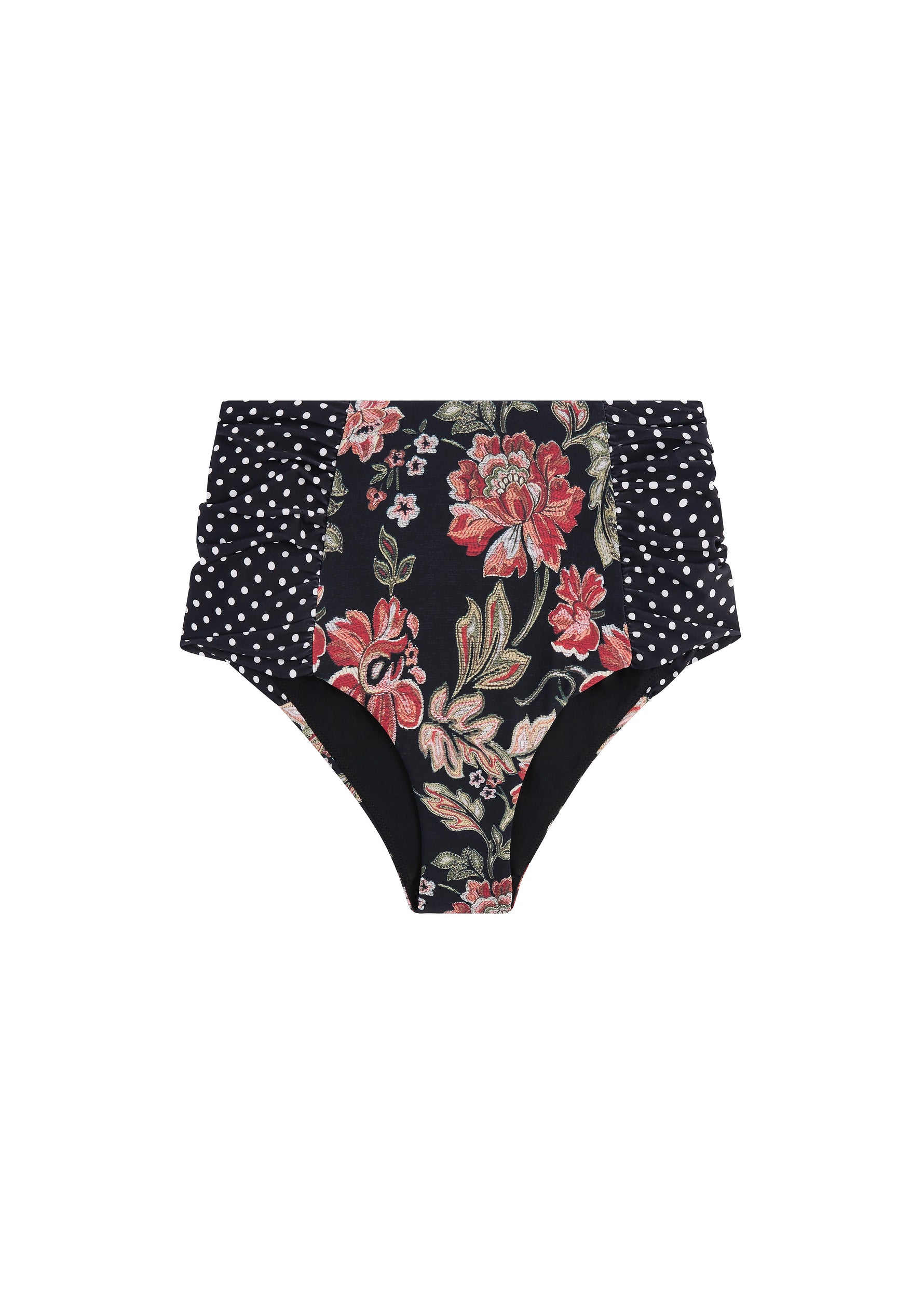 The Kalani High-Waisted Bottom in our new Vesper print spliced with classic polka dots is a flattering swim staple with a high-rise fit, gathered side panels, and medium coverage. Crafted from sustainable recycled nylon, it pairs perfectly with the matching Sculpt Bikini Top for a chic summer set you can feel extra good about.
