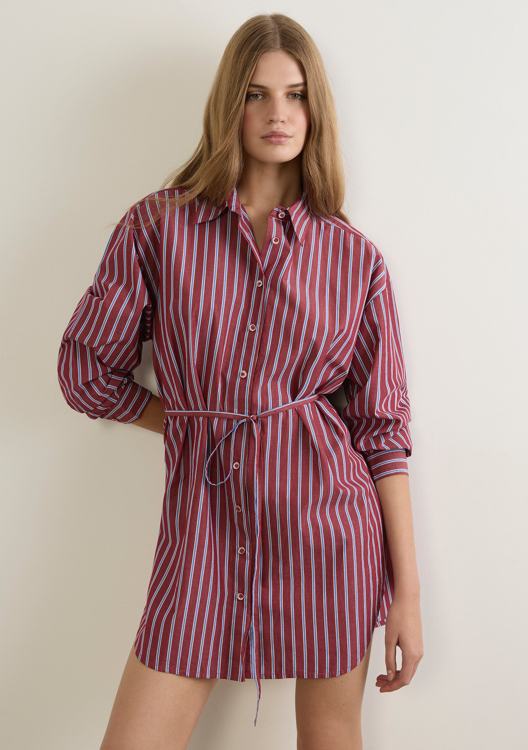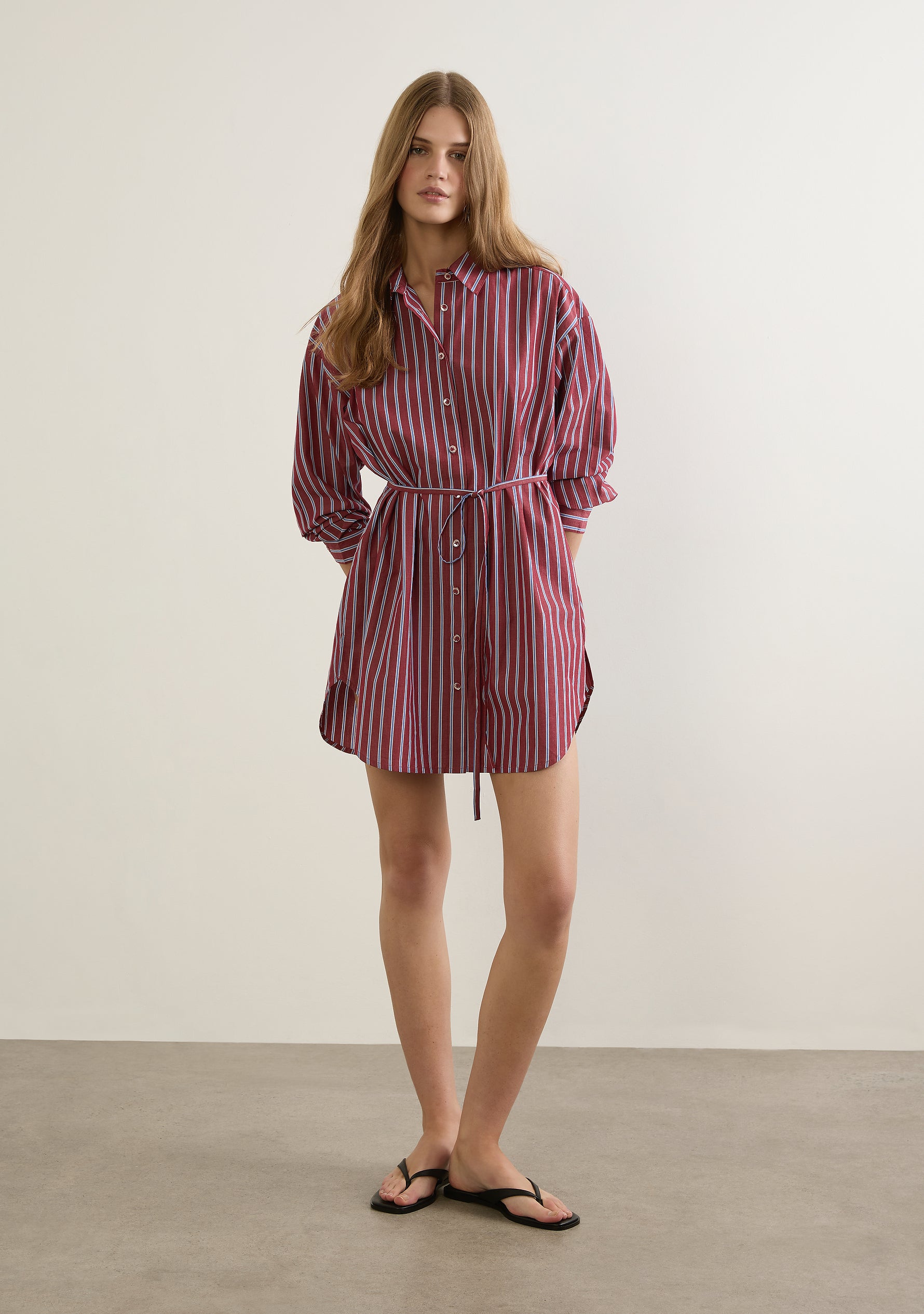 The Odin Shirt Dress in washed-back red with blue and white woven pinstripes is a chic new staple. Designed with a classic shirt collar, button-front closure, and pocket with back yoke detailing. Finished with an optional waist tie, this versatile style can be worn loose and relaxed, cinched in for a more defined silhouette, or layered over swim for effortless beach-to-bar dressing.