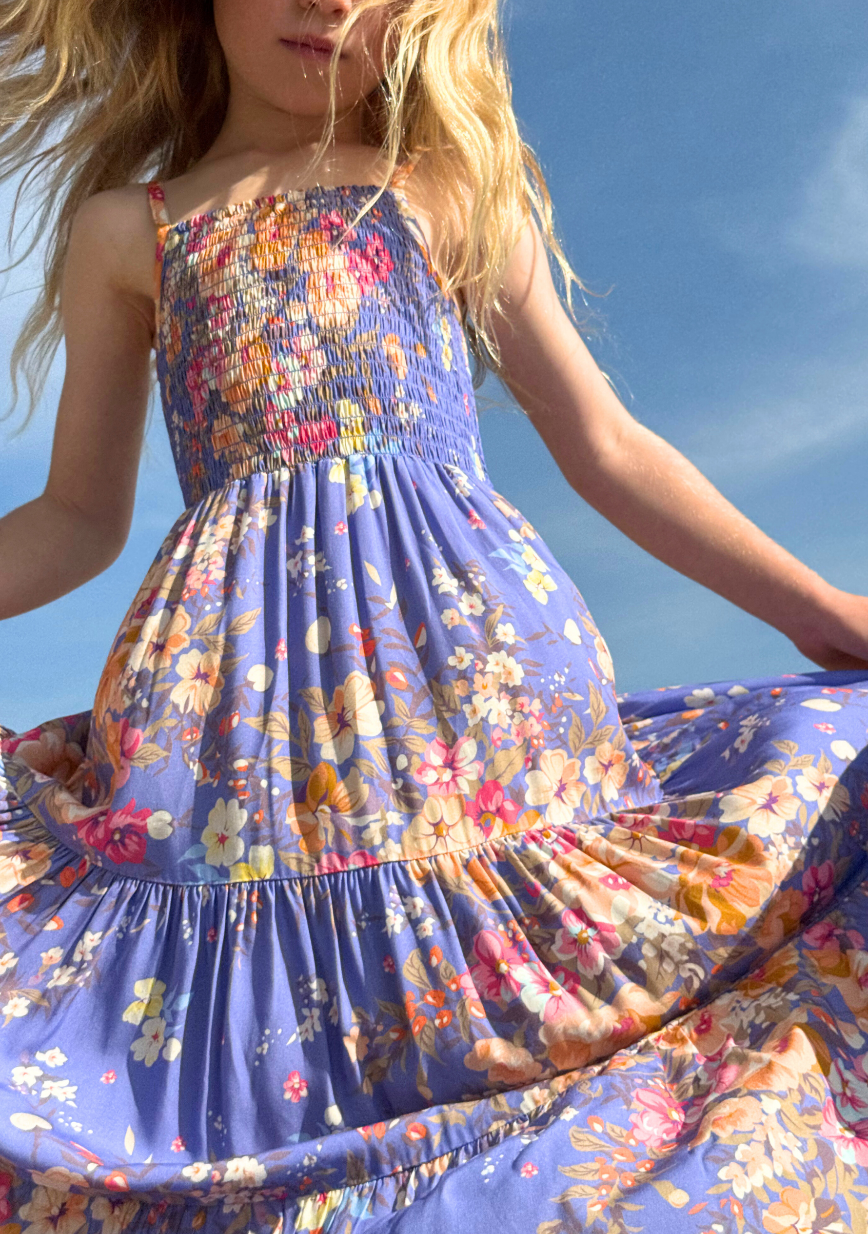 The best-selling Little Auguste Sweetheart Maxi Dress in our lavender Camelia Floral, crafted from 100% rayon, features a shirred bodice for growth, adjustable straps, and a full-volume tiered skirt perfect for twirling. Available in matching mummy-and-me styles, it’s destined to be her favourite dress — a Little Auguste bestseller, exclusively online and in-store.