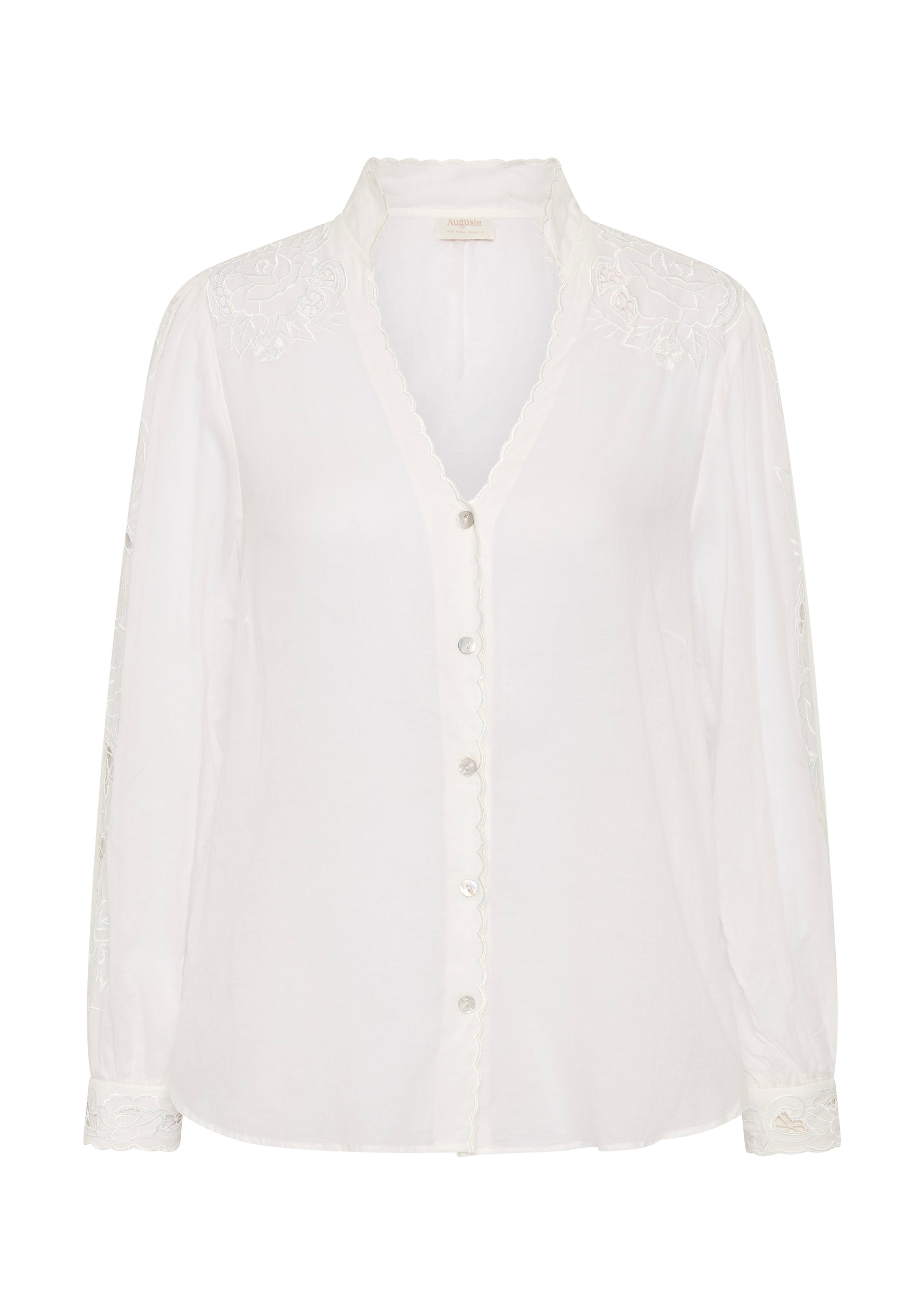 The Talia Blouse in warm white is crafted from soft, lightweight cotton with a semi-sheer finish and natural drape. Designed with a refined mandarin collar and flattering V neckline, it features a button-front closure and long blouson sleeves adorned with intricate, abundant embroidery that trails down the arms — the true statement of the piece. Hand-embroidered by our talented artisans, Talia is a true celebration of craftsmanship.