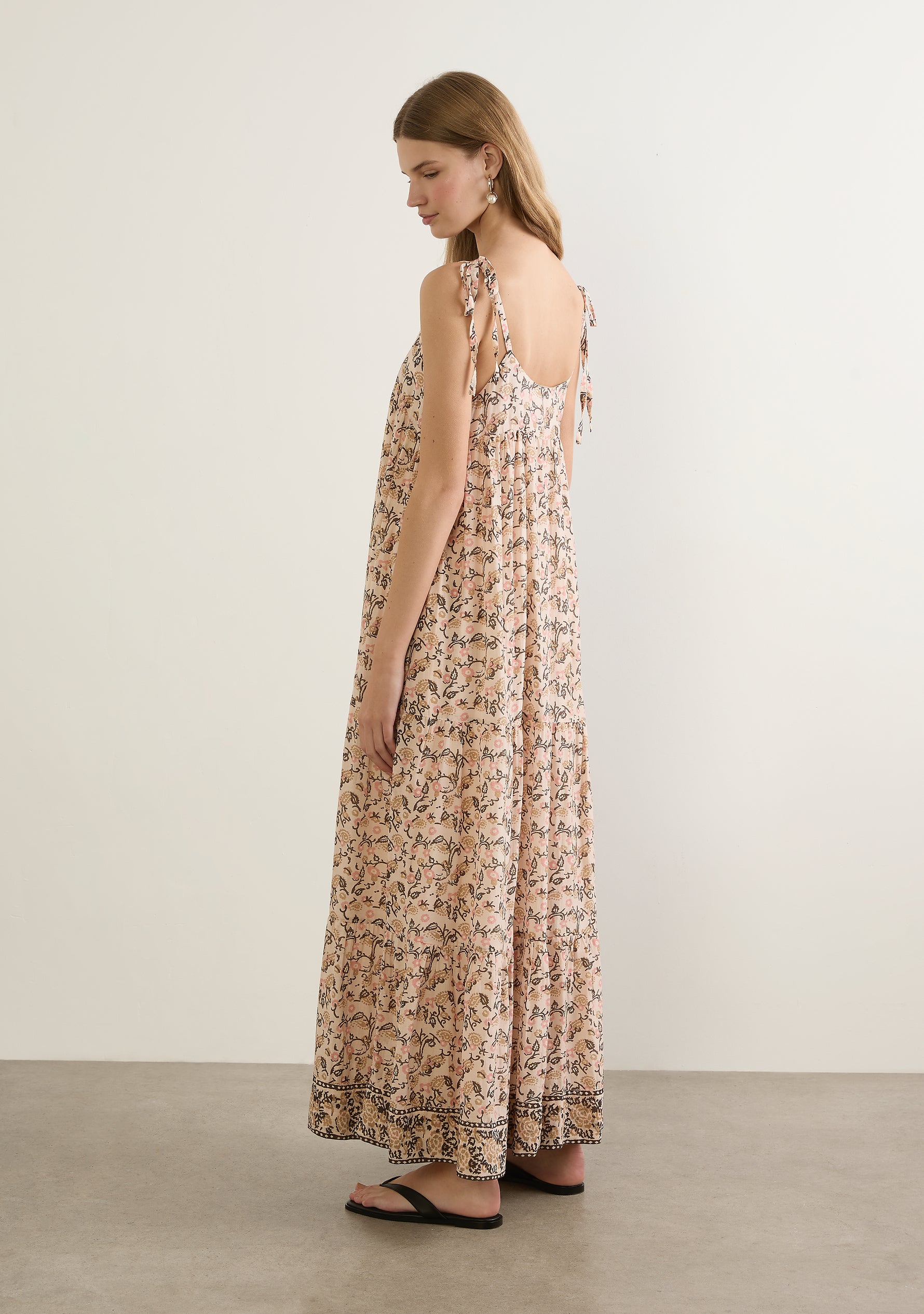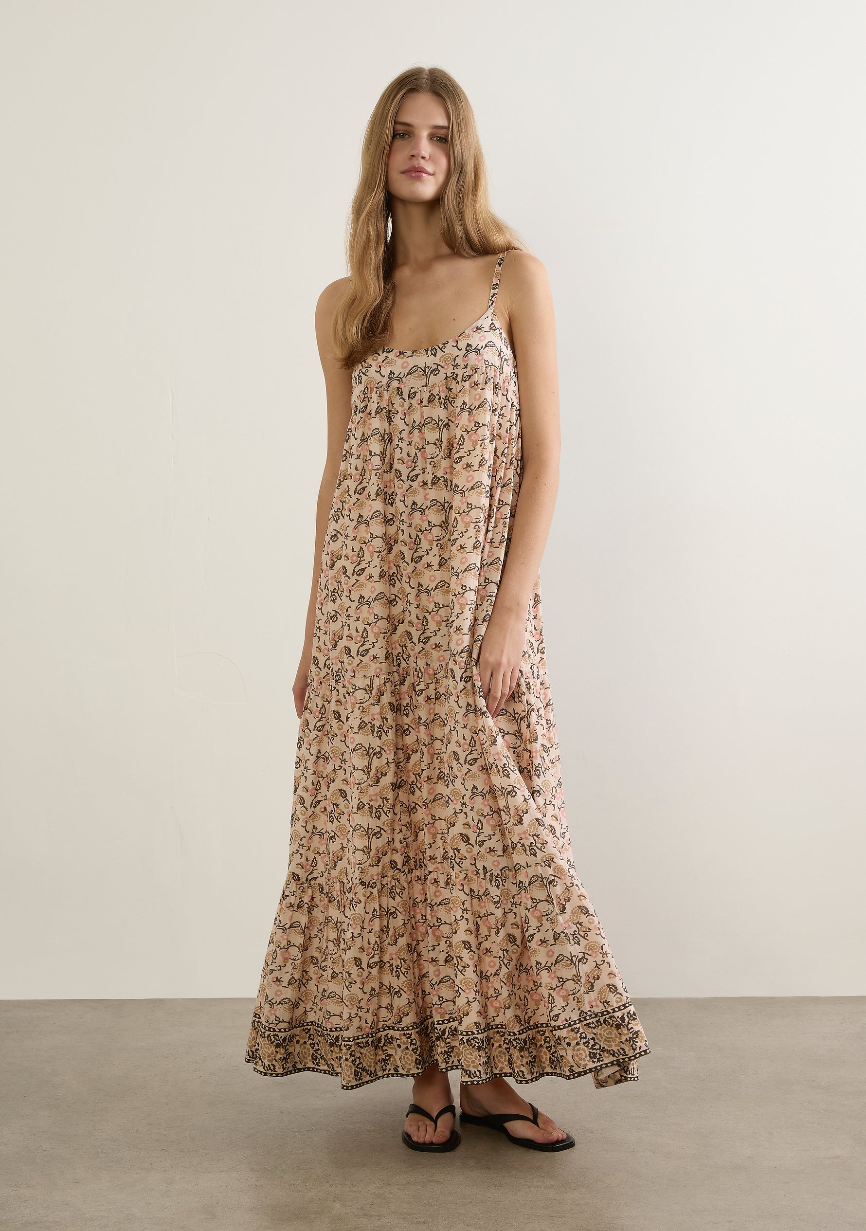 The True Maxi Dress in the oat Sonder print is a magical bohemian masterpiece designed to have you floating through summer. Crafted from a luxurious cotton–silk blend, it features a soft round neckline with functional tie straps and a beautifully voluminous, tiered maxi silhouette. Intended for a relaxed fit with an airy, floaty feel, this effortlessly romantic style moves with ease and captures that carefree, sun-drenched spirit.