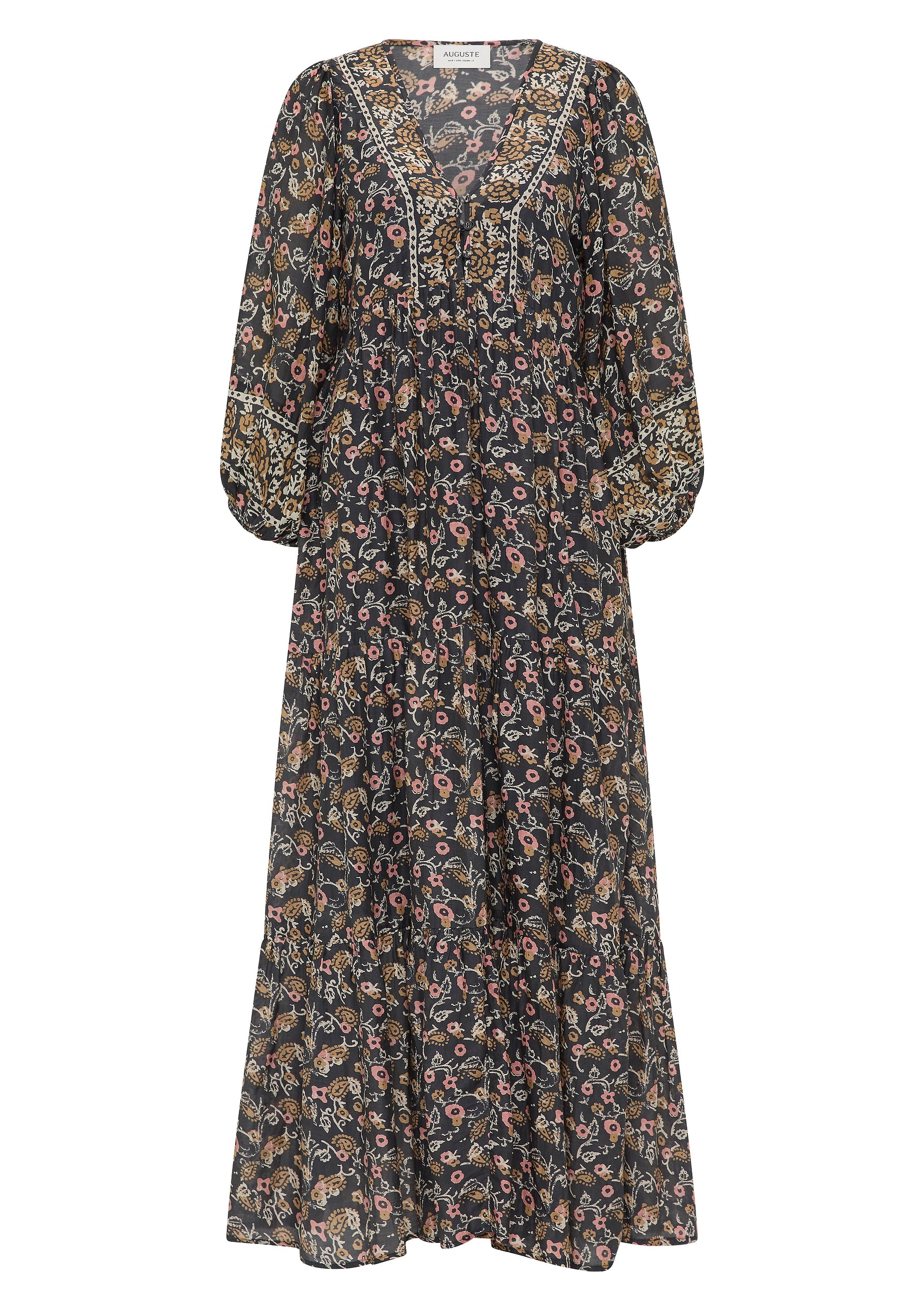 The Valley Maxi Dress in our new charcoal Sonder print captures an elevated bohemian spirit with its detailed border print and refined, airy cotton–silk voile. A soft V neckline and voluminous tiered silhouette create a floaty, sculptural movement that feels effortlessly sophisticated.